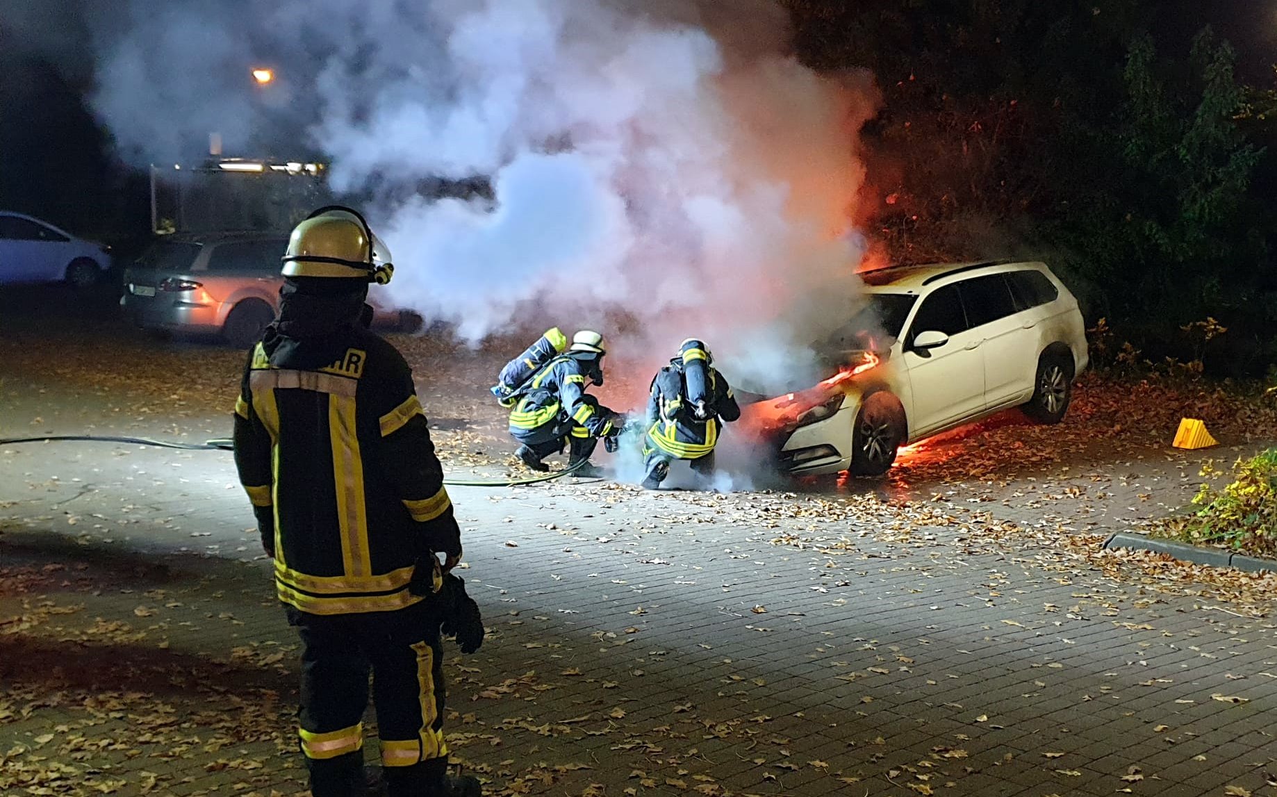 Beim Eintreffen der drei beteiligten Feuerwehrfahrzeuge stand der Kombi bereits im vorderen Bereich in Vollbrand. Der eingesetzte Atemschutztrupp ging mit Schnellangriffsschlauch und Löschschaum zur Brandbekämpfung vor. Anschließend wurden noch versteckte Brandnester mit der Wärmebildkamera gesucht und gezielt abgelöscht.