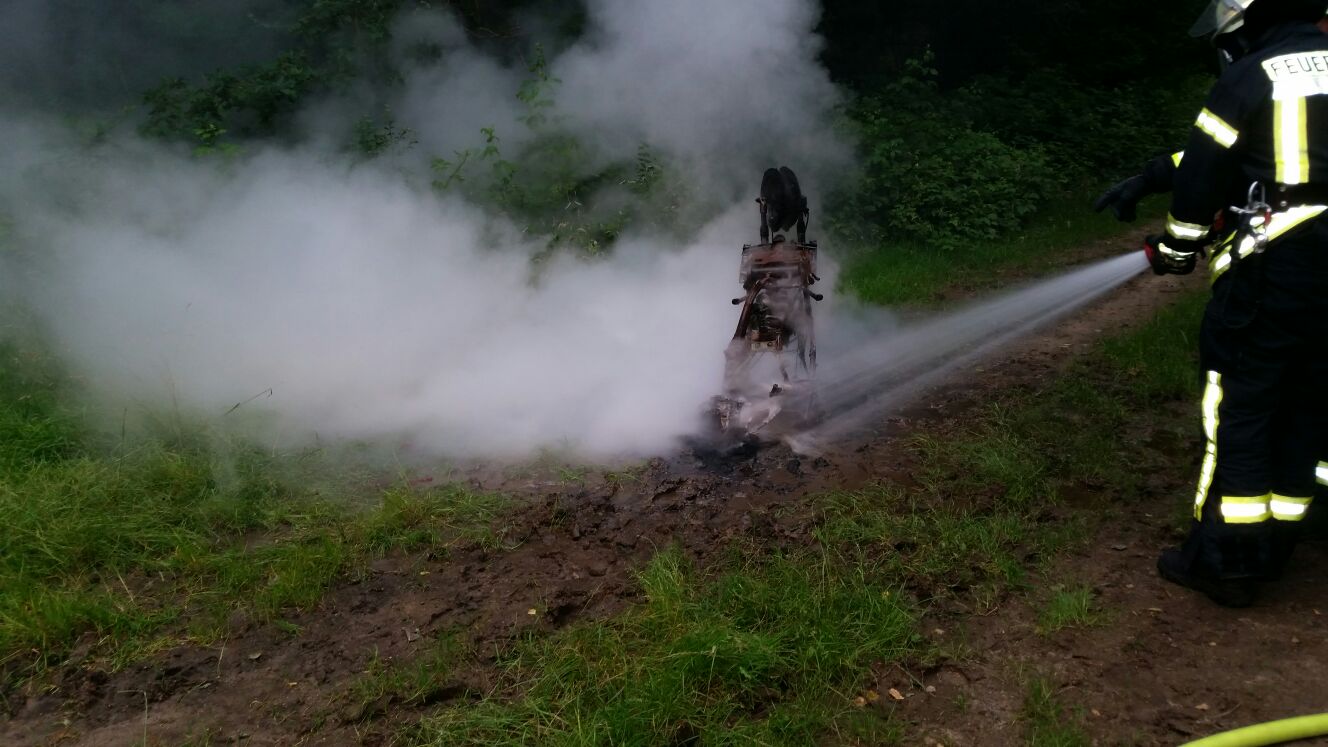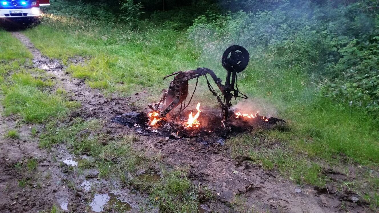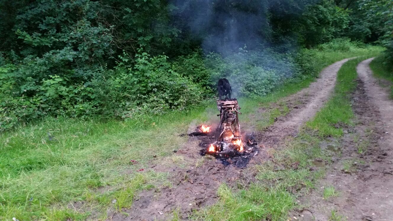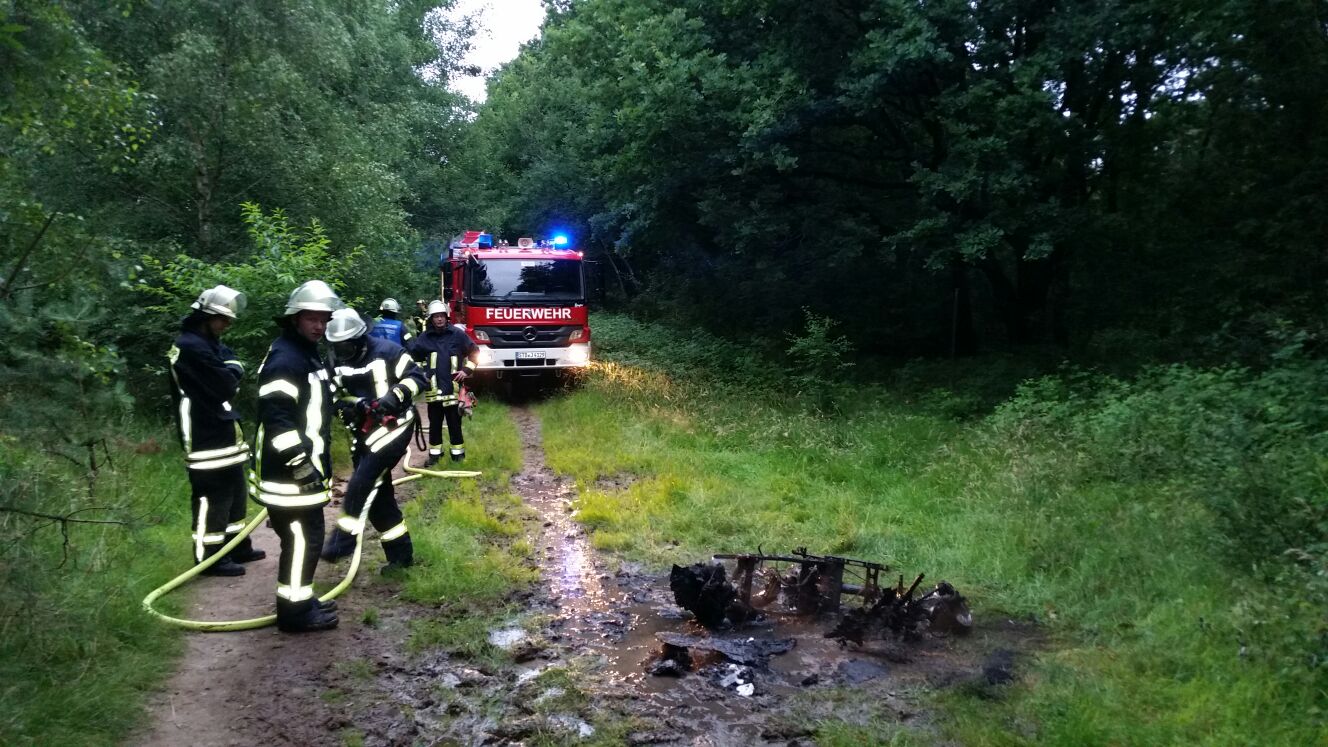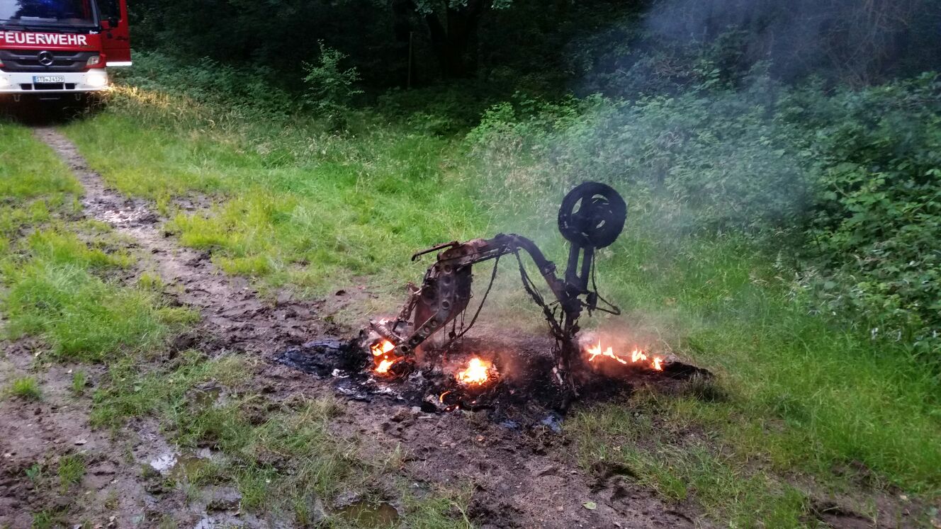Vor Ort fanden die Kräfte aus Ottensen einen brennenden Motorroller auf einem Waldweg. Das bereits völlig abgebrannte Fahrzeug wurde von den Einsatzkräften mit einem C-Rohr abgelöscht. Zur Beschädigung der umliegenden Vegetation kam es nicht.