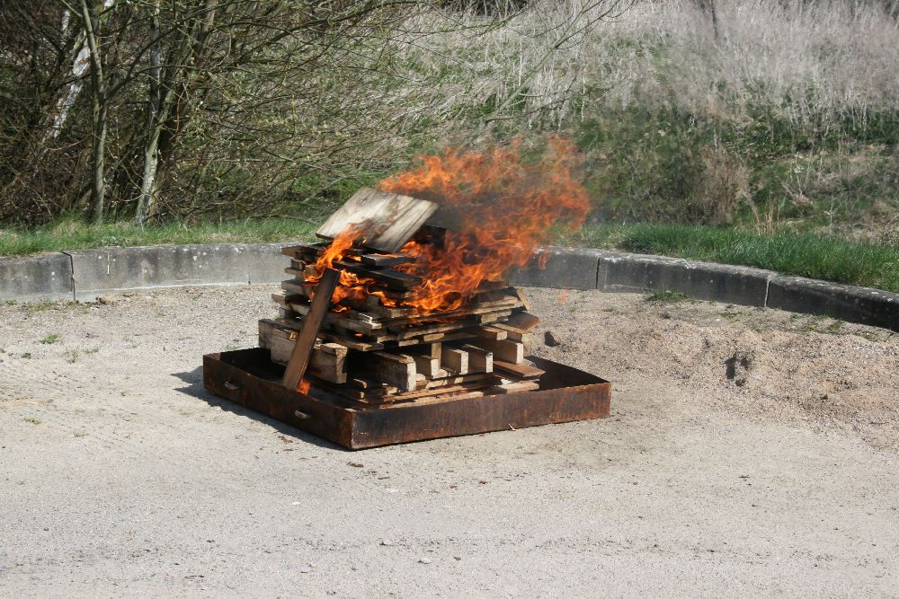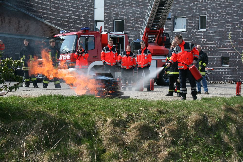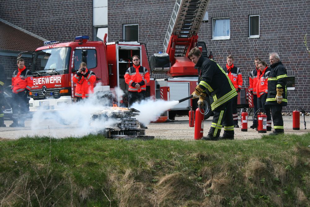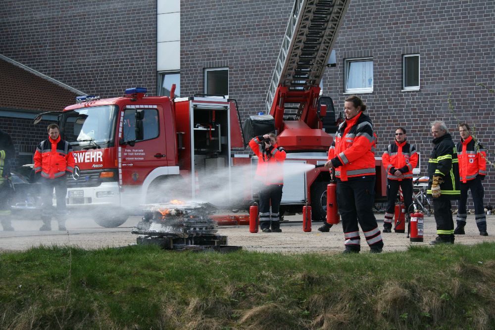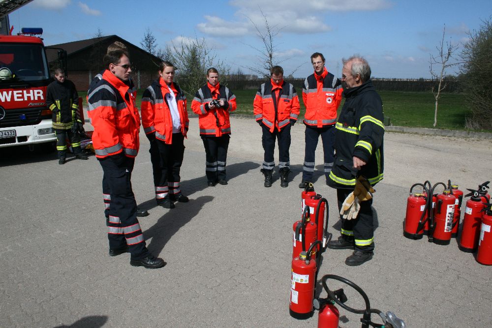 Während der anschließenden Feuerlöschübung an einem brennenden Holzstapel wurde von den DRK-Kräften nach einer kurzen Einweisung der richtige Umgang mit Feuerlöschern geprobt.