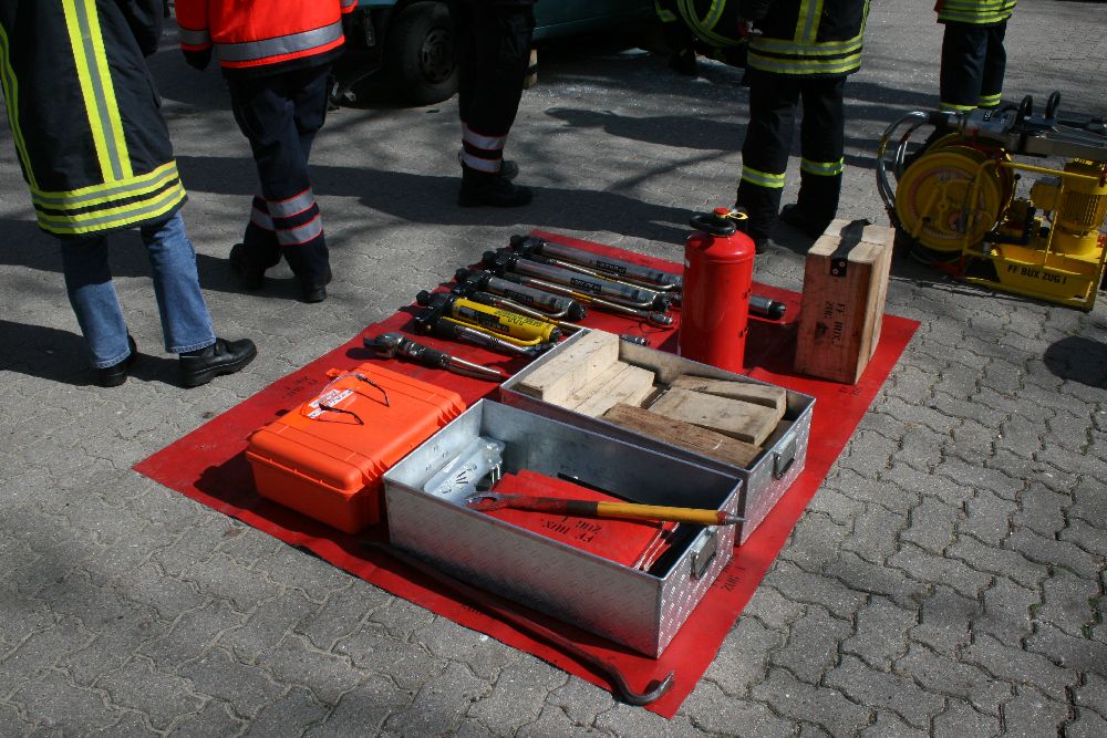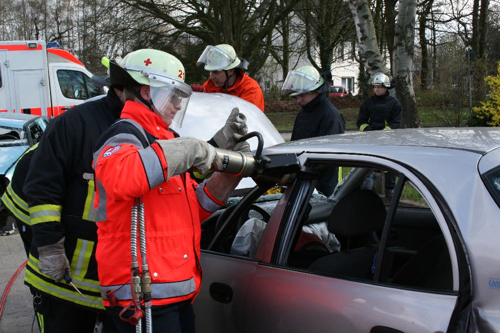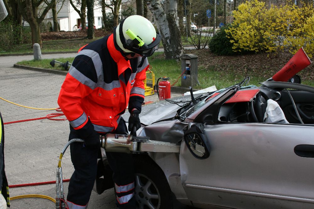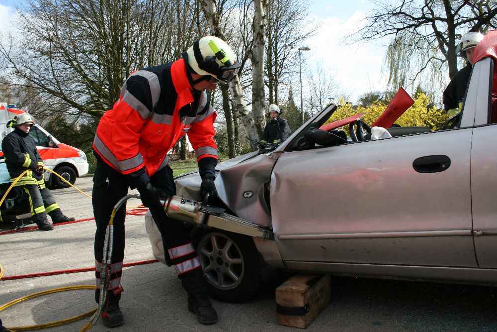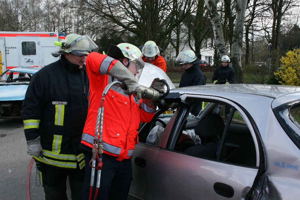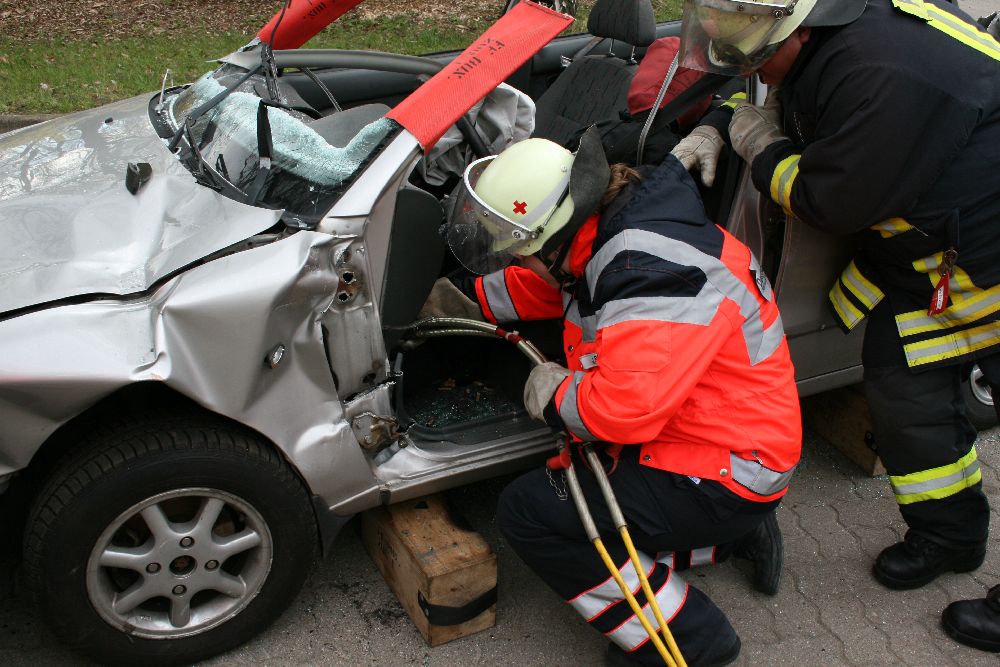 Bei einer simulierten Unfallrettung aus einem Pkw sollten die Rettungskräfte unter Anleitung selbst Schere und Spreizer in die Hand nehmen, um die technischen Zusammenhänge und Vorgehensweisen beim Zerschneiden eines Unfallfahrzeugs zu verstehen.
