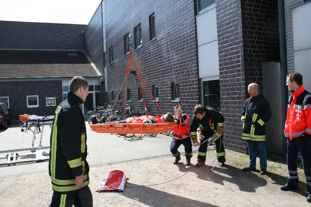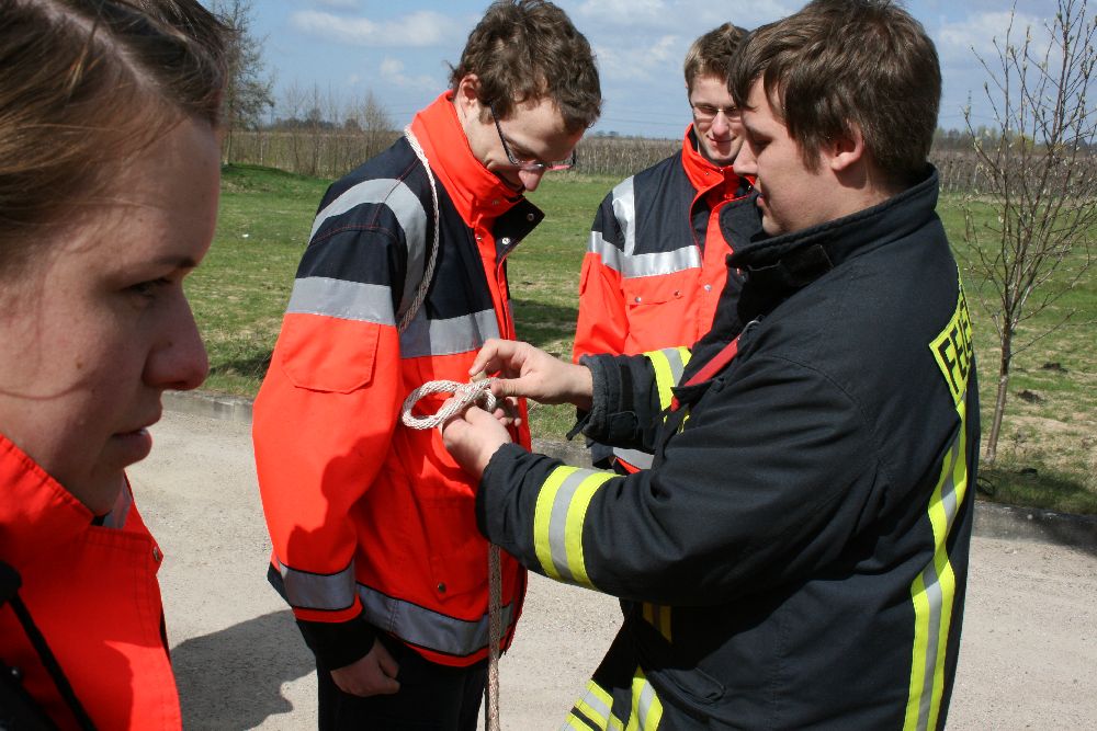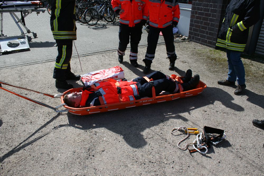 Zum Abschluss der Übungen sollten alle Rettungsdienstler eine Möglichkeit erlernen, sich mit der auf dem Rettungswagen mitgeführten Feuerwehrleine selbst zu sichern.