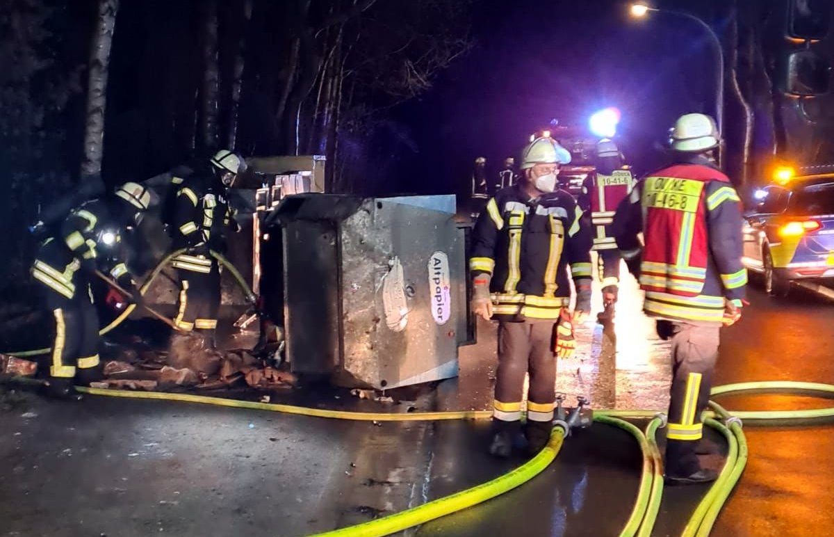 Das ausrückende Hilfeleistungslöschfahrzeug vom Zug I wurde letztlich nicht benötigt und konnte in Bereitstellung gehen. Die Wehren aus Immenbeck und Ovelgönne leerten den brennenden Container und löschten das Brandgut unter Atemschutz mit einem C-Rohr.