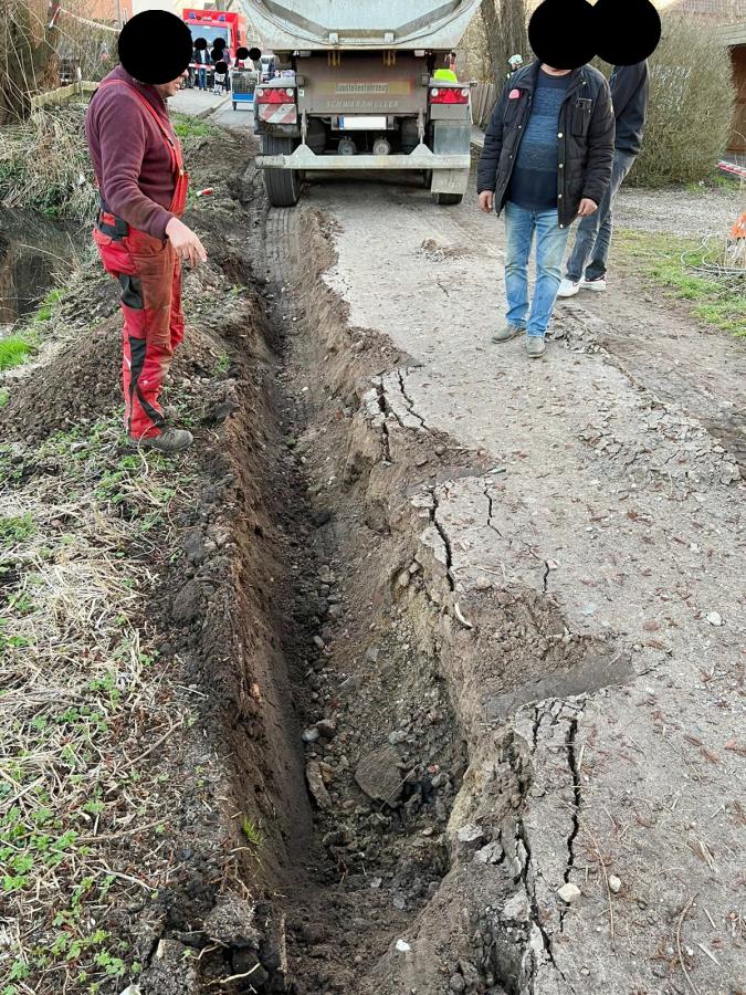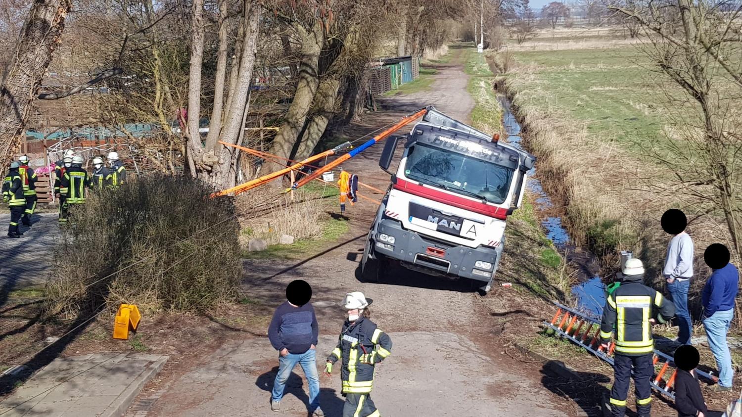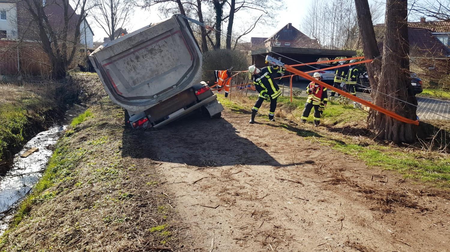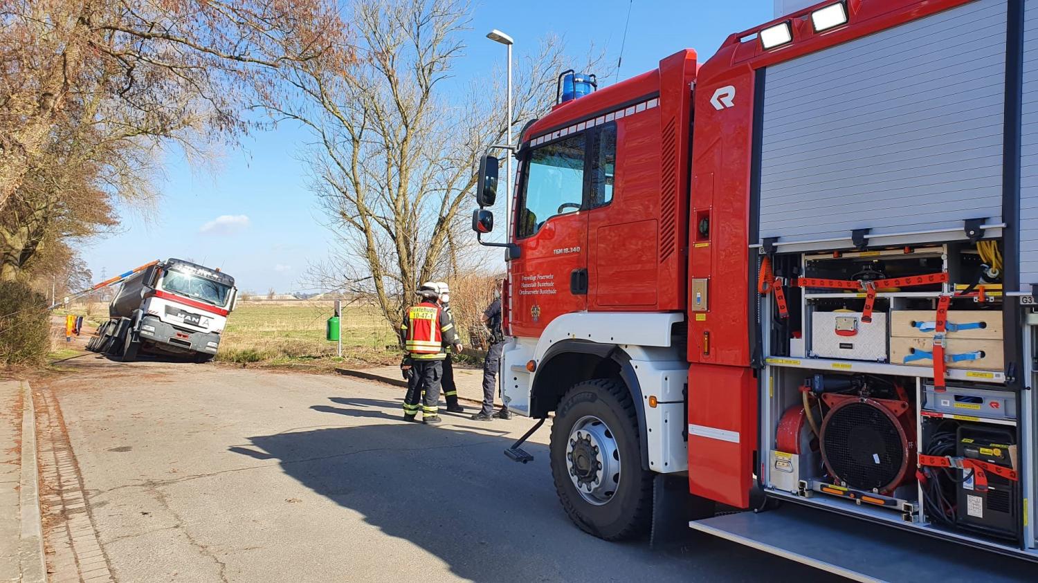 In der Verlängerung des Bollwegs kam am Freitagmittag der Fahrer eines Sattelzuges mit Kippmulde vom schmalen Wirtschaftsweg ab. Das schwer beladene Fahrzeug geriet augenblicklich in eine Schräglage und drohte in einen parallel verlaufenden Graben zu rutschen.