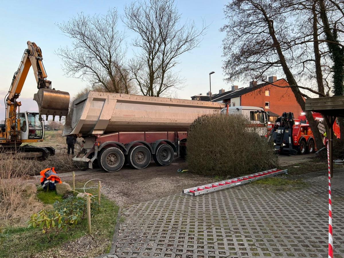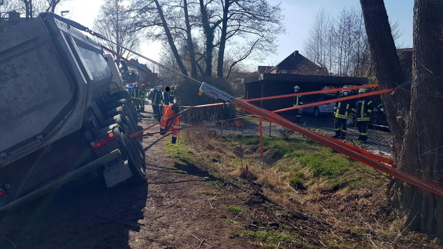 Die alarmierten Einsatzkräfte vom Zug I der Ortsfeuerwehr Buxtehude sicherten die Kippmulde mit Hilfe dreier Mehrzweckzüge und konnte die Gefahr des Umkippens so minimieren.