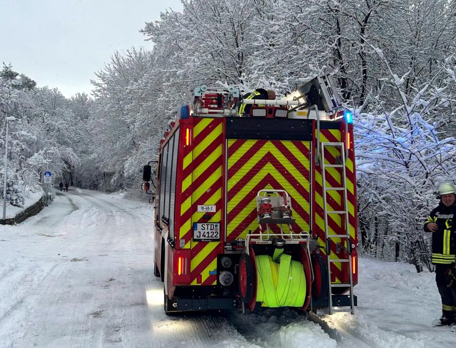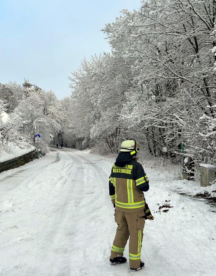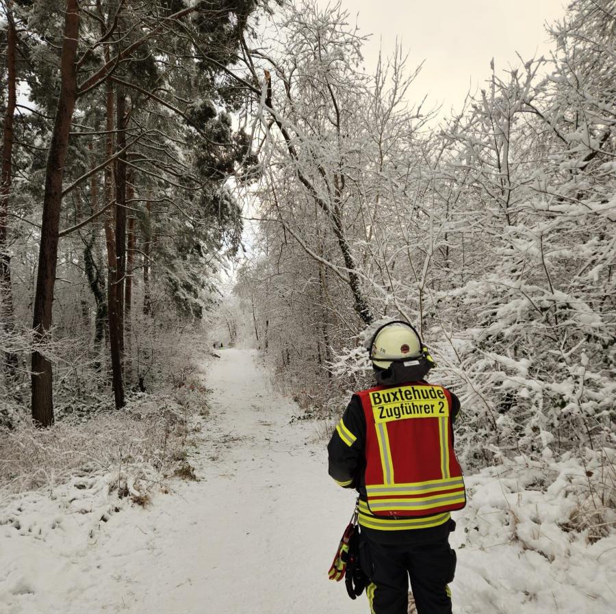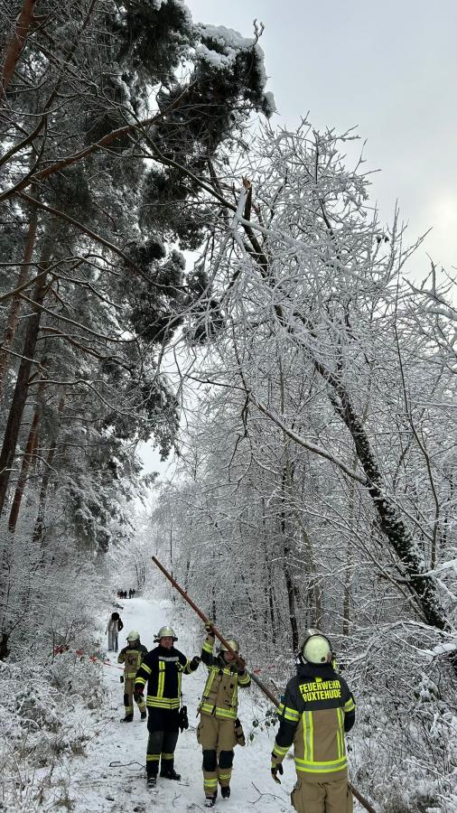 Nach Erkundung der Lage durch die alarmierten Einsatzkräfte vom Zug II der Ortsfeuerwehr Buxtehude wurde, auf Weisung des Ordnungsamtes, der betroffene Baum gefällt, da die Strecke bei Schnee gerne als Rodelpiste genutzt wird.