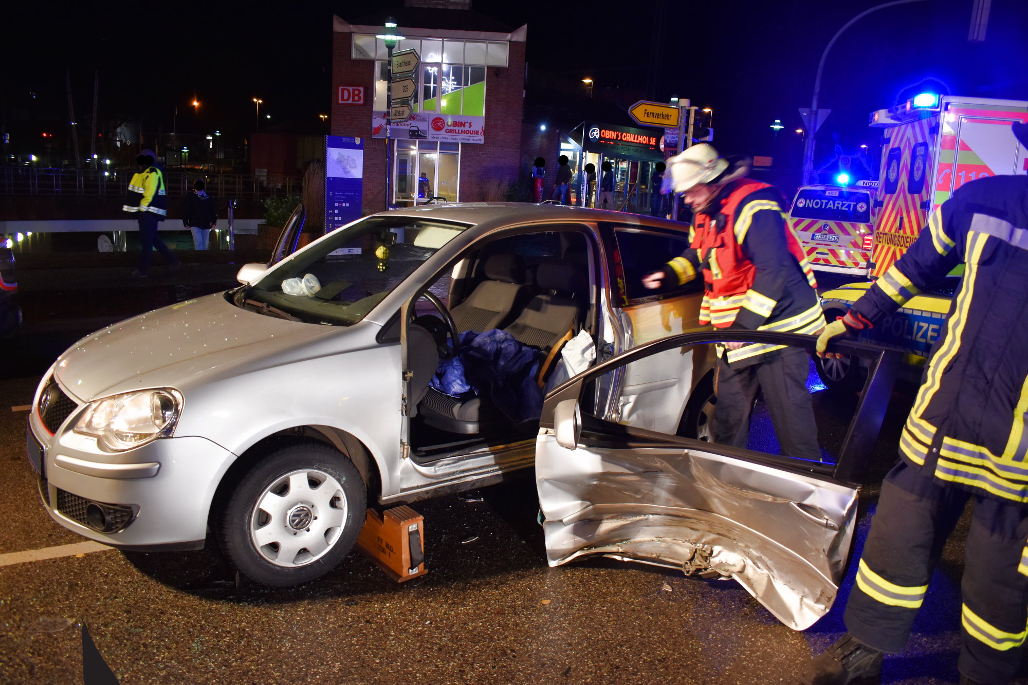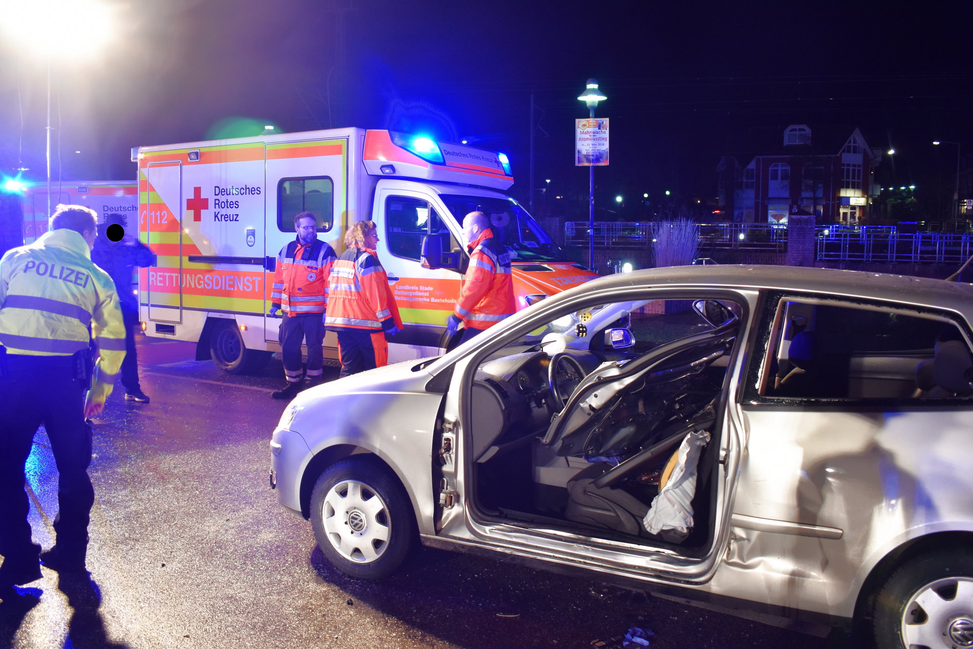 Zu einem schweren Verkehrsunfall kam es am späten Samstagabend auf der Kreuzung Bahnhofstraße / Gildestraße am Buxtehuder Bahnhof. Ein aus Richtung Innenstadt kommender Fahrer eines silbernen Kleinwagens war trotz vorfahrberechtigtem Querverkehrs bei abgeschalteter, aber blinkender Ampel in die Kreuzung eingefahren. Ein aus Richtung Ellerbruchtunnel kommender schwarzer PKW konnte nicht mehr rechtzeitig bremsen und fuhr frontal in die Fahrerseite des silbernen Fahrzeugs.