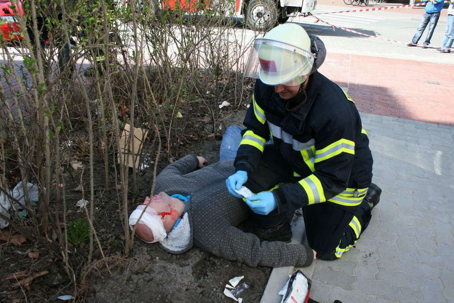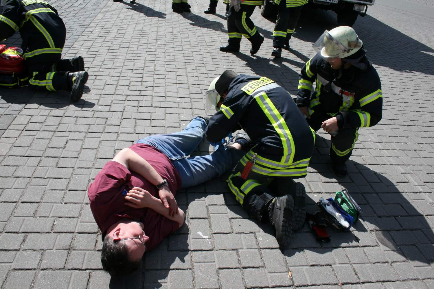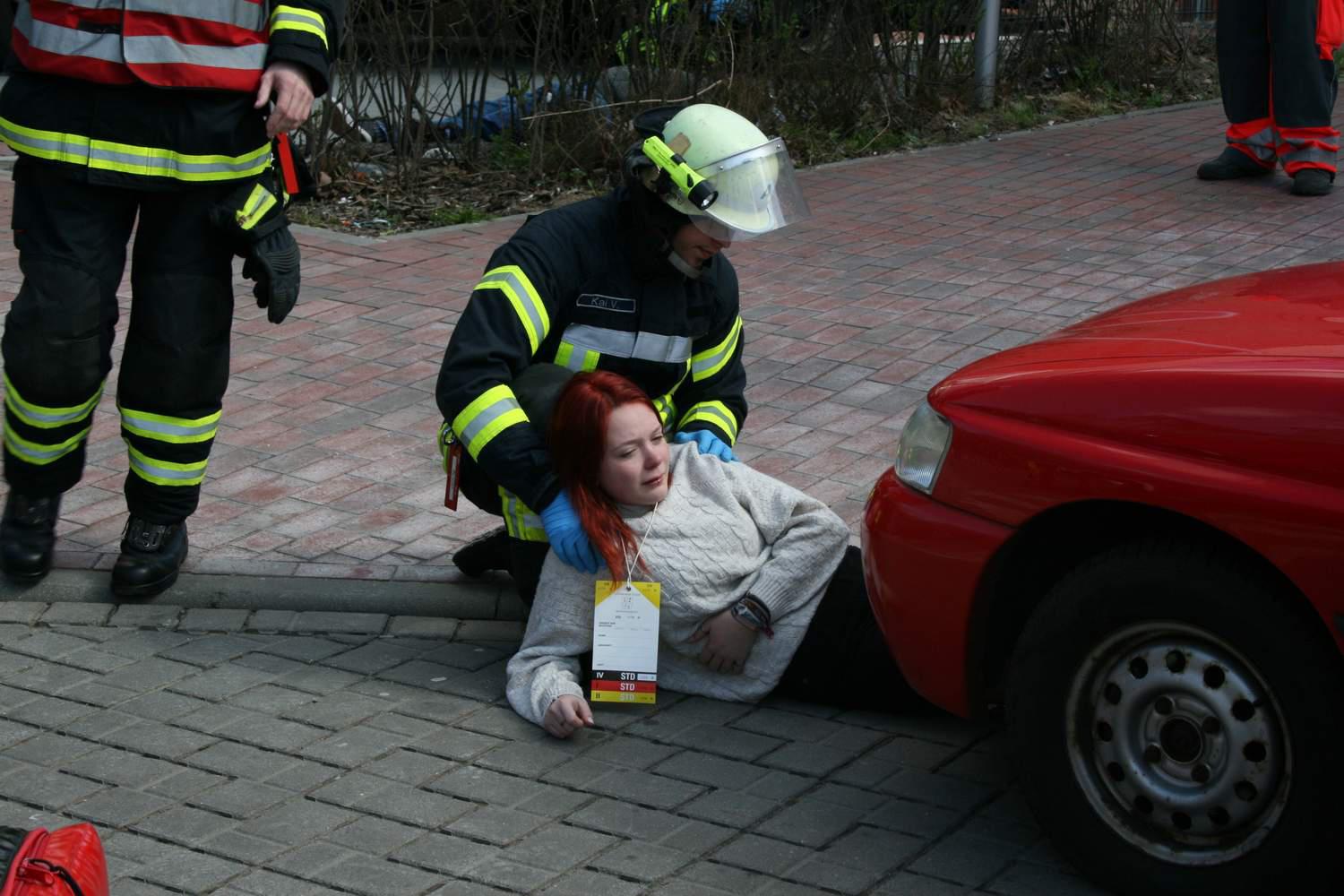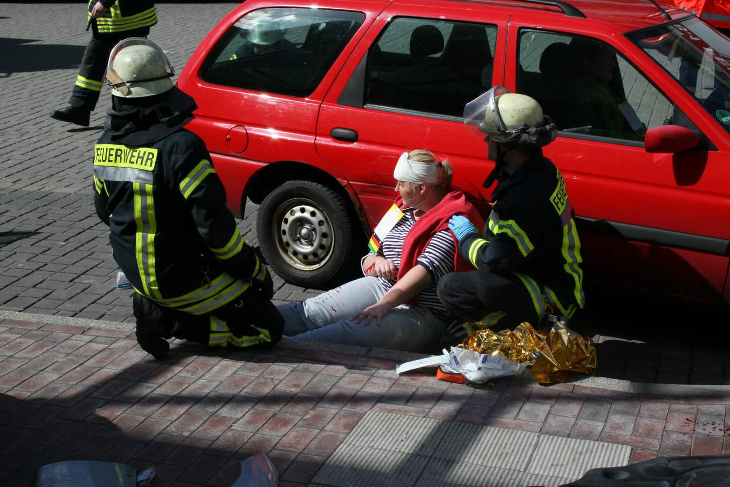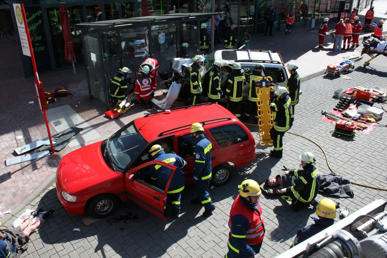 Zu einem schweren Verkehrsunfall musste am Samstagmittag der Zug I der Ortwehr Buxtehude zum Busbahnhof ausrücken. Der Fahrer eines Geländewagens hatte aufgrund nicht angepasster Geschwindigkeit einen weiteren PKW touchiert. Beide Fahrzeuge gerieten ins Schleudern und prallten frontal in eine Menschenmenge an einem Bussteig. Insgesamt zehn Verletzte waren zu beklagen.Beim Eintreffen der ersten Kräfte der Feuerwehr war die Lage zunächst sehr unübersichtlich. Im gesamten Bereich um die Unfallstelle lagen Verletzte. Der Unfallverursacher war in seinem Fahrzeug eingeklemmt. Unter dem zweiten Fahrzeug klemmte eine weitere Verletzte. Eine Person wurde durch den Aufprall über 20 Meter durch die Luft geschleudert. Sie lag schwerverletzt in einer Hecke.Im Gegensatz zu einem normalen Einsatz, wo die Kräfte des Rettungsdienstes meist zuerst an der Einsatzstelle eintreffen, war bei diesem dramatischen Einsatz am Anfang noch kein Rettungswagen vor Ort. So mussten die Einsatzkräfte der Feuerwehr zunächst eine Verletztenversorgung und -betreuung vornehmen. Weitere Unterstützung gab es dabei durch die Kräfte eines Gerätekraftwagens vom Technischen Hilfswerk Buxtehude.Erst im Laufe der Erstversorgung trafen die ersten Einsatzkräfte des Rettungsdienstes an der Einsatzstelle ein. Hierbei handelte es sich um die DRK-Bereitschaft Buxtehude. Kurz nacheinander trafen auch die Bereitschaften aus Drochtersen und Stade ein. Gemeinsam mit Feuerwehr und THW wurden nun die Verletzten versorgt und durch die Rettungswagen ins Krankenhaus befördert.Parallel dazu wurden die beiden eingeklemmten Personen aus bzw. unter dem Fahrzeug von der Feuerwehr befreit. Bei dem Einsatz handelte es sich glücklicherweise nur um eine perfekt inszenierte Übung, ausgearbeitet durch Stephan Glinicki. Für einige Schaulustige schien die Übung allerdings fast zu perfekt, sie wollten als Ersthelfer mit am Szenario teilnehmen. Auch eine Hamburger Polizistin, die zufällig vor Ort war, erkundigte sich, warum denn ihre Buxtehuder Kollegen noch nicht vor Ort wären und ob sie schon einmal mit einer Zeugenbefragung beginnen sollte.