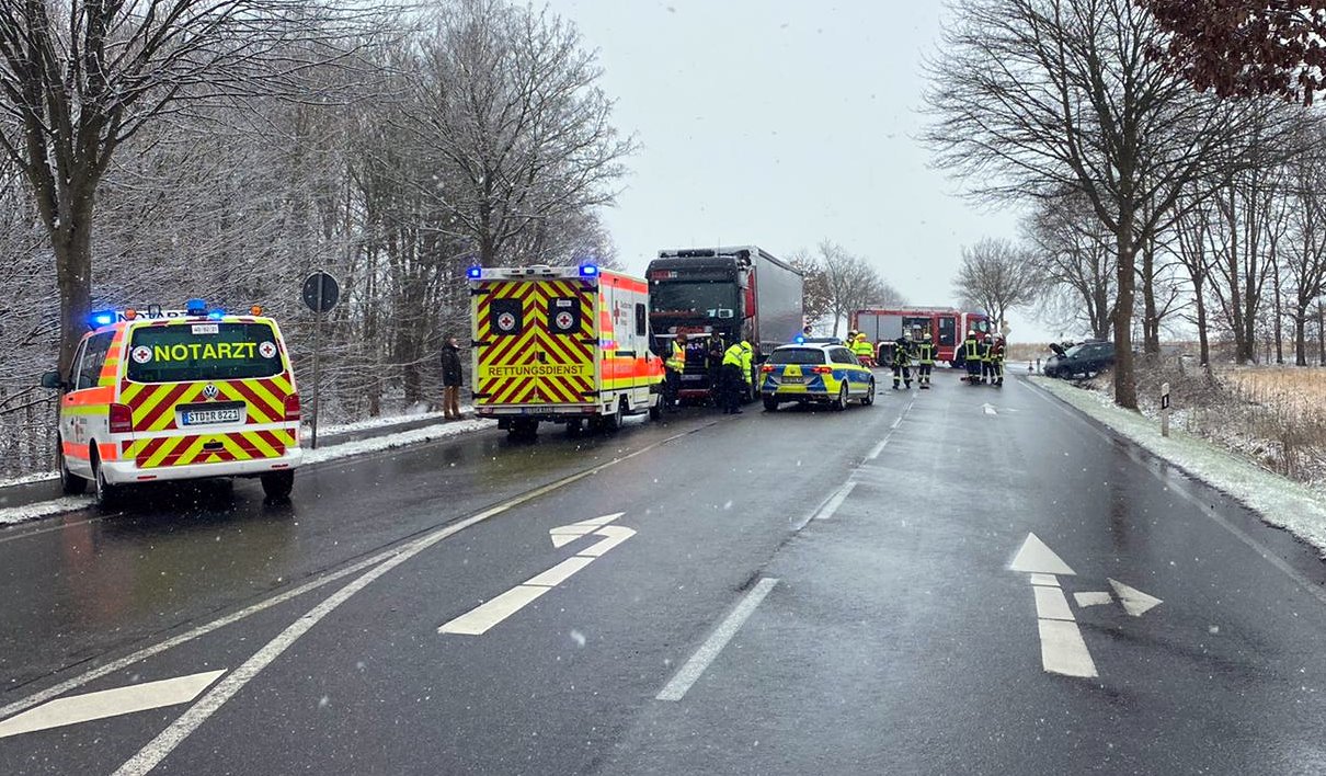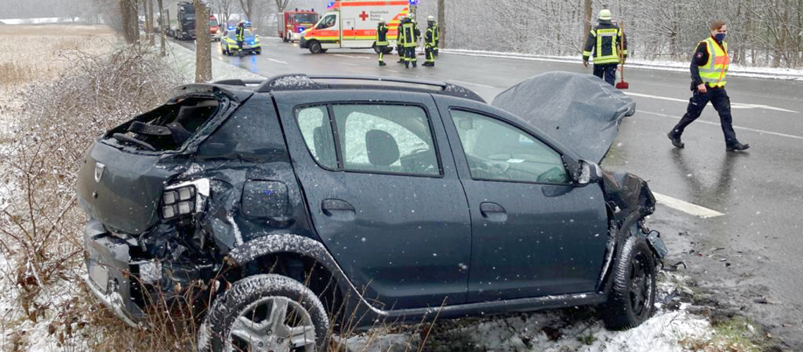 Ein schwerer Verkehrsunfall ereignete sich am Dienstagmorgen auf der Bundesstraße 3 in Höhe der Abfahrt zum Abfallwirtschaftszentrum. Ein PKW-Fahrer wollte, aus Richtung AWZ kommend, auf die B3 in Richtung Ovelgönne abbiegen. Dabei übersah er einen aus Richtung Elstorf herannahenden Sattelzug. Die Zugmaschine erfasste den Wagen und schleuderte ihn über die Bundesstraße. Das Heck des PKW schlug dabei erneut in den Sattelauflieger ein. Erst daraufhin kam der Wagen im Seitenraum zum Stehen.