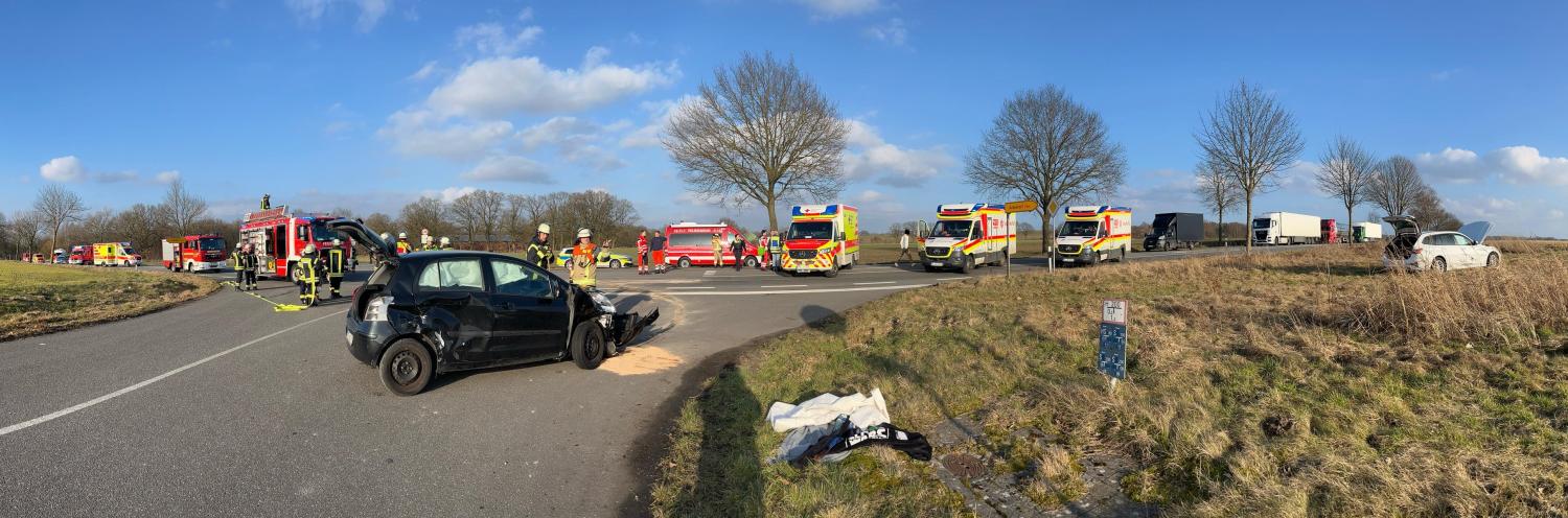 Der Fahrer eines Kleinwagens wollte in Höhe der Kreuzung Ketzendorf/Ovelgönner Straße die Bundesstraße kreuzen und in Richtung Ardestorf fahren. Dabei übersah er vermutlich einen aus Buxtehude kommenden Mittelklasse PKW, der auf der vorfahrtberechtigten B3 unterwegs war. Durch den Aufprall direkt auf der Kreuzung wurde der Kleinwagen herum geschleudert und von dem Mittelklasse Kombi gleich doppelt getroffen. Der Kleinwagen blieb völlig zerstört im Kreuzungsbereich liegen, der Kombi kam erst auf einem angrenzenden Feld zum Stehen. Insgesamt zehn Personen saßen in den beiden Fahrzeugen. Die sechs Insassen des Kleinwagens und eine Mitfahrerin des Kombis, inklusive einer schwangeren Frau, kamen mit Verletzungen in Krankenhäuser nach Stade und Harburg.