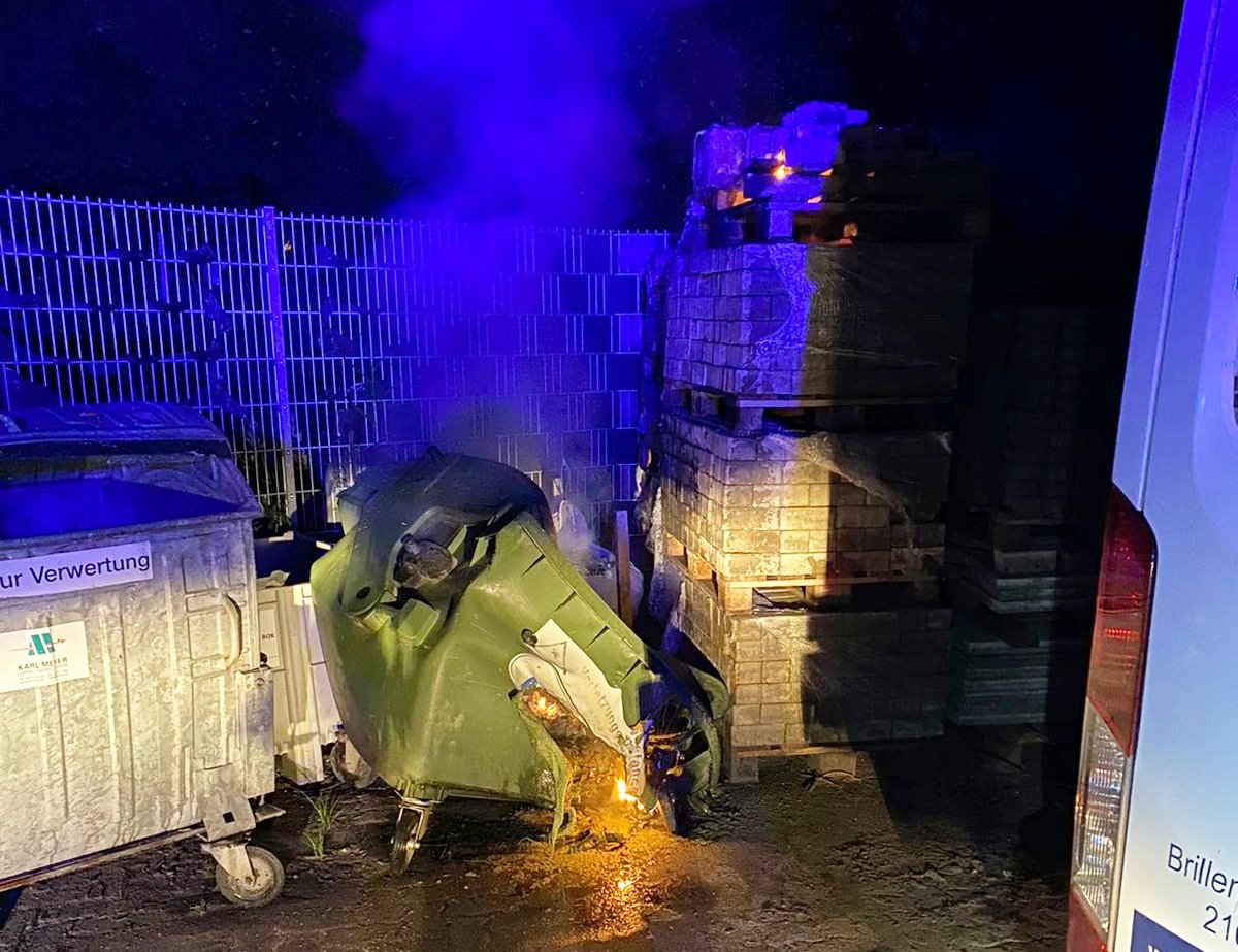Da von den beiden ersten Einsatzstellen keine weitere Gefahr ausging, konnten umgehend alle Kräfte in den Brillenburgkamp verlegt werden. Als die drei Fahrzeuge in den Brillenburgskamp einbogen, wurde schnell klar, dass es sich dort um mindestens zwei weitere Brände handeln würde. Durch eine erste schnelle Erkundung wurde folgendes festgestellt: In der Verlängerung des Brillenburgskamps brannte an einem Container ein Haufen Unrat. Das Feuer breitete sich auf den Behälter weiter aus. Ca. 100 Meter weiter brannte ein 1000 Liter Müllcontainer und ein weiteres Brandereignis konnte im Verlauf des Brillenburgkamps festgestellt werden, dort brannte ein PKW.
