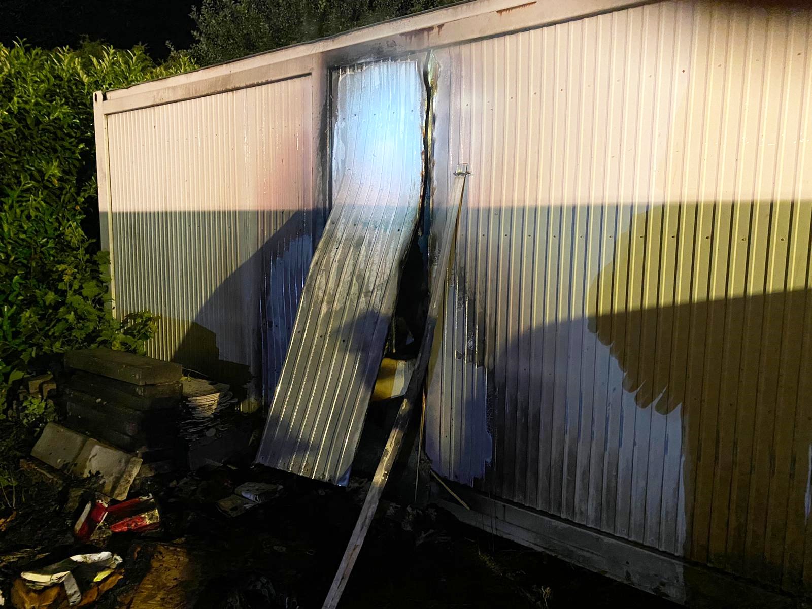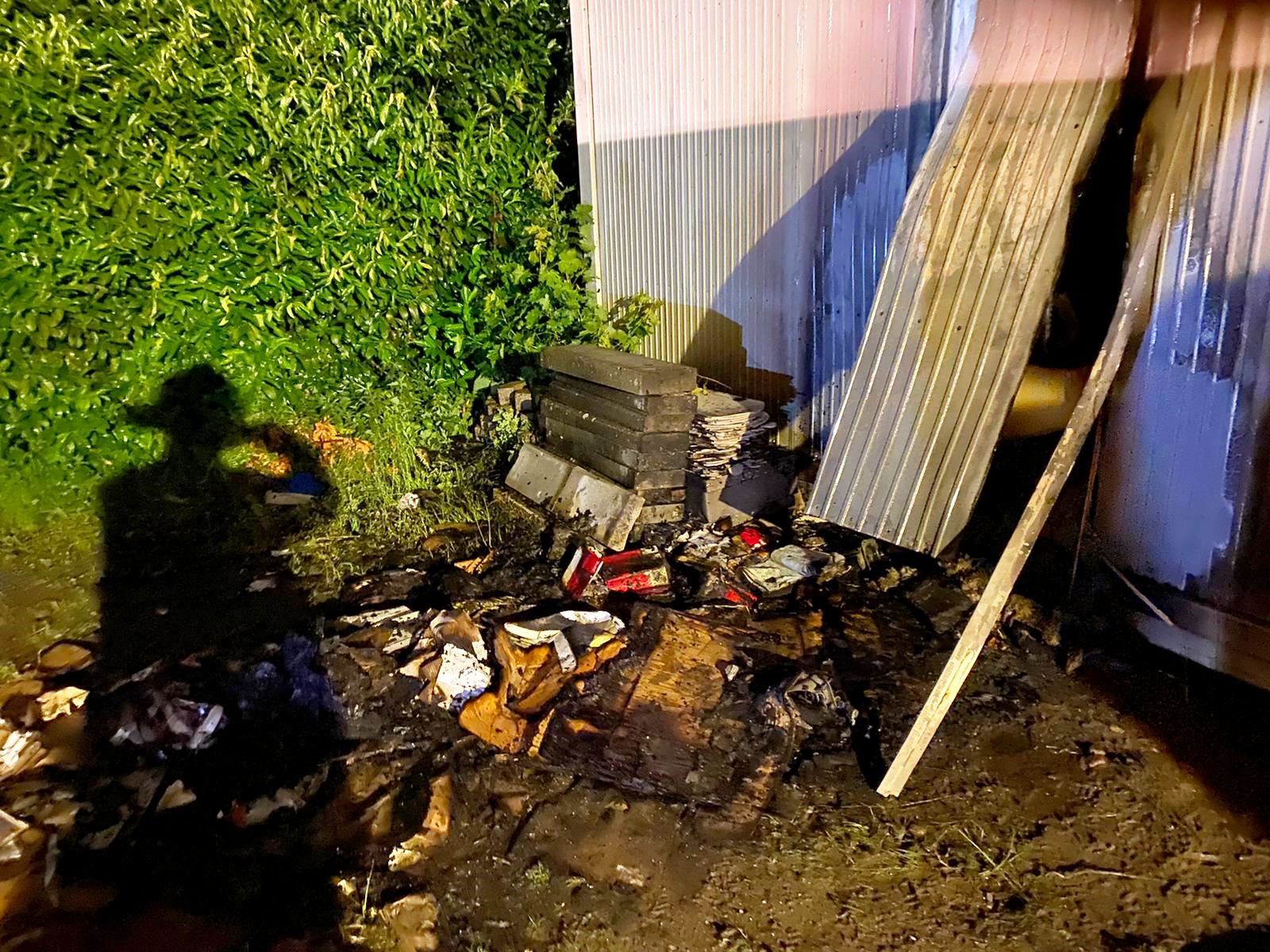 Das zuerst eintreffende Hilfeleistungslöschfahrzeug (HLF), wurde von den Bewohnern und zwei Polizeibeamten in Empfang genommen und kurz eingewiesen: Eine Altpapiertonne hatte unter einem kleinen Holzunterstand gebrannt. Dies wurde frühzeitig durch einen umsichtigen Taxifahrer erkannt, der die Tonne unter dem Unterstand hervorzog. Noch vor dem Eintreffen der Feuerwehr hat ein Anwohner das Feuer mittels Eimer gelöscht, so dass am Holzunterstand kein größerer Schaden entstand.