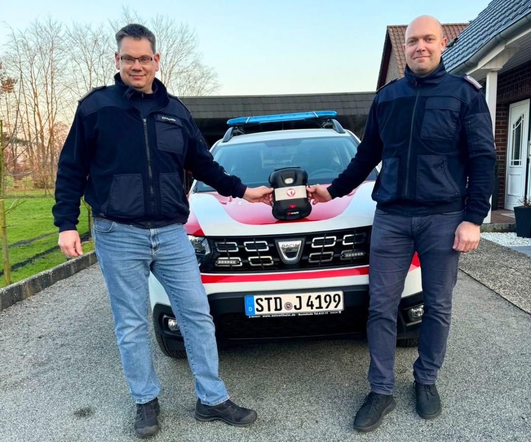 Der Ortsbrandmeister Dennis Rathjen (Ortsfeuerwehr Dammhausen) hat Anfang März eine tolle Spende durch den Stadtbrandmeister Nils Krugmeier überreicht bekommen. Ein automatischer externer Defibrillator (AED) ist nun in Dammhausen fest auf dem Fahrzeug verlastet und kann sofort zur Rettung von Menschenleben eingesetzt werden. Grund für die Spende der Firma Reher & Ramsden aus Hamburg, vertreten durch den Geschäftsführer Uwe Puppel, war der unermüdliche Einsatz (Hochwasserlage) der Feuerwehr Buxtehude über Weihnachten. Herr Puppel war sehr beeindruckt von dieser Leistung und fragte den Stadtbrandmeister Krugmeier, ob noch etwas gebraucht werden würde. In dem Gespräch wurden die vier AED Gruppen genannt und kurzerhand durfte ein neues AED Gerät im Wert von rund 2000€ für Dammhausen bestellt werden. Das Gerät wurde anschließend übergeben und die Einweisung durchgeführt.
