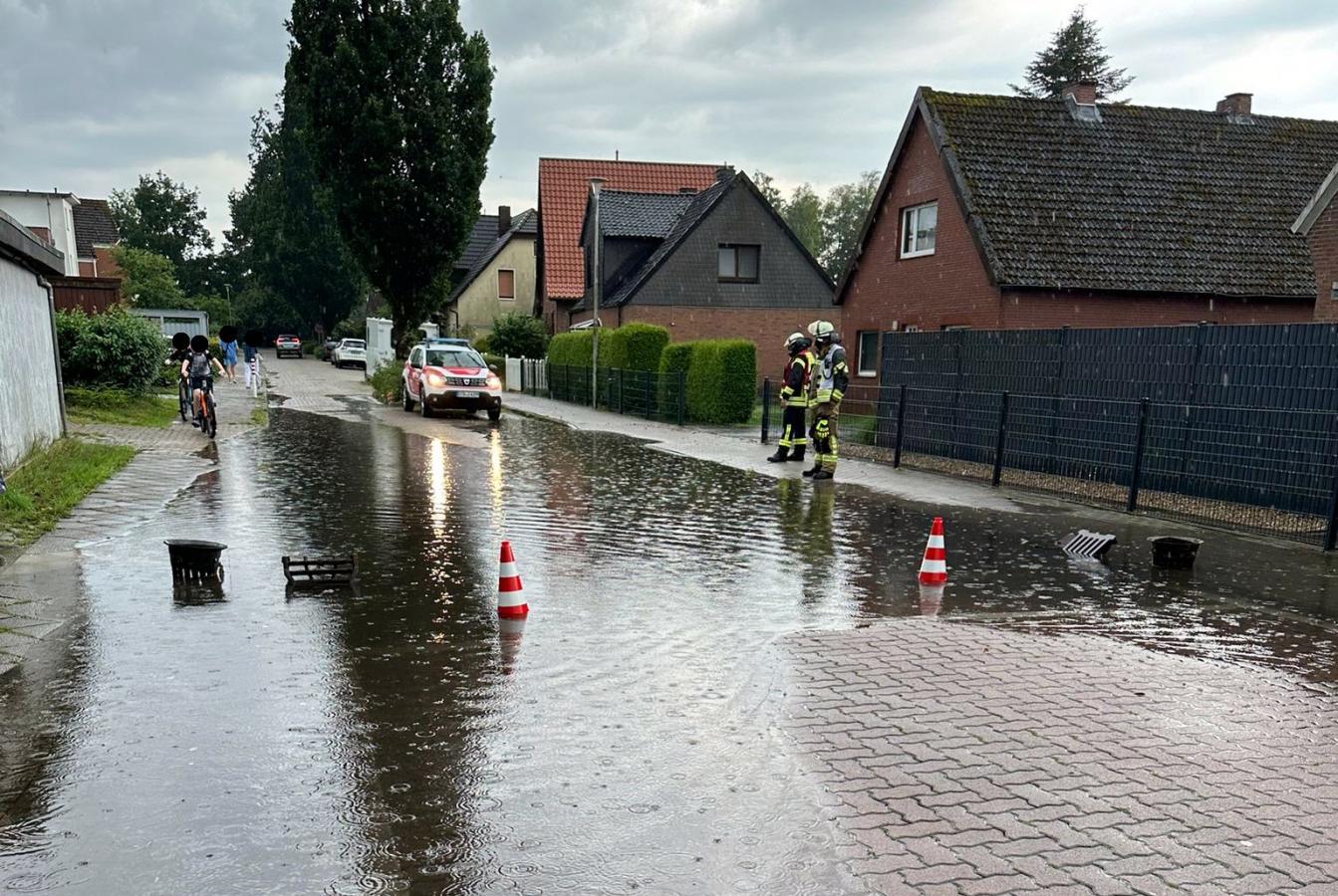 Beim Eintreffen der alarmierten Feuerwehrkräfte vom Zug II der Ortsfeuerwehr Buxtehude hatten Anwohner bereits die Abläufe geöffnet und gereinigt. Aufgrund der Menge im gesamten Bereich floss das Wasser dennoch kaum ab. Zur Sicherheit sperrten die Einsatzkräfte die Gefahrenstelle mit einer Vollsperrung ab. Erst nach etwa 20 Minuten war ein eigenständiges Abfließen des Wassers möglich. In der Zeit wurde der Nahbereich erkundet, um ein mögliches Volllaufen von Kellern zu verhindern. Durch die Wassermassen wurde ein Revisionsschacht umspült, den die Einsatzkräfte durch die städtischen Betriebe absichern ließen.