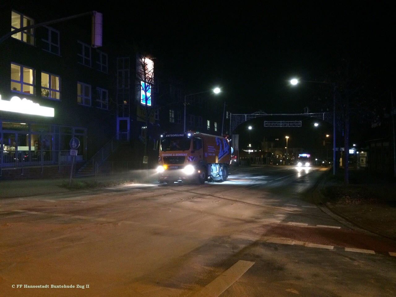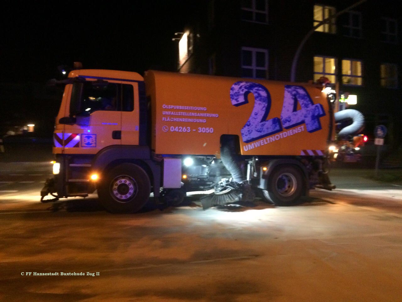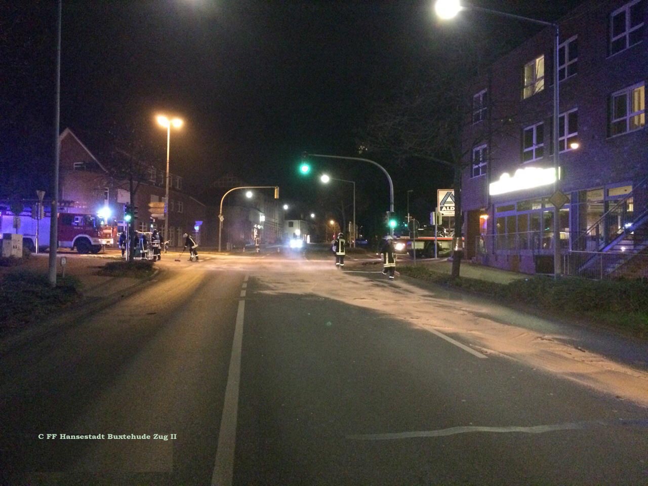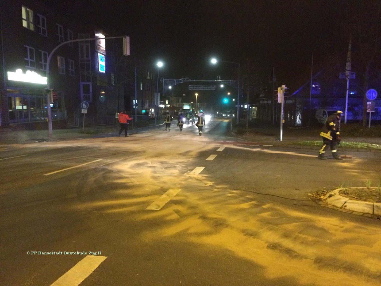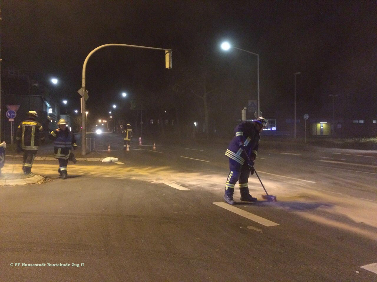 Zur Beseitigung des Gefahrenbereichs wurde durch die Buxtehuder Polizei der Zug II der Ortsfeuerwehr Buxtehude hinzugezogen. Die Einsatzkräfte streuten den bereits verteilten Ölaustritt weiträumig ab. Nach Begutachtung der Einsatzstelle durch das Buxtehuder Ordnungsamt wurde schließlich eine Spezialfirma aus Scheeßel angefordert, die die Einsatzstelle mit einem Ölspurbeseitigungsfahrzeug ausführlich reinigte. Erst nach dreieinhalb Stunden war der Einsatz beendet und die Einsatzkräfte konnten wieder einrücken.