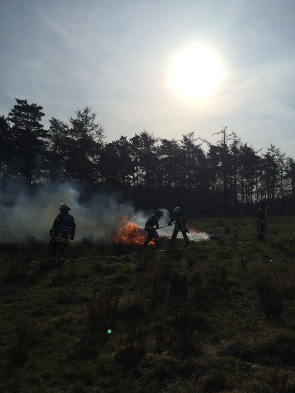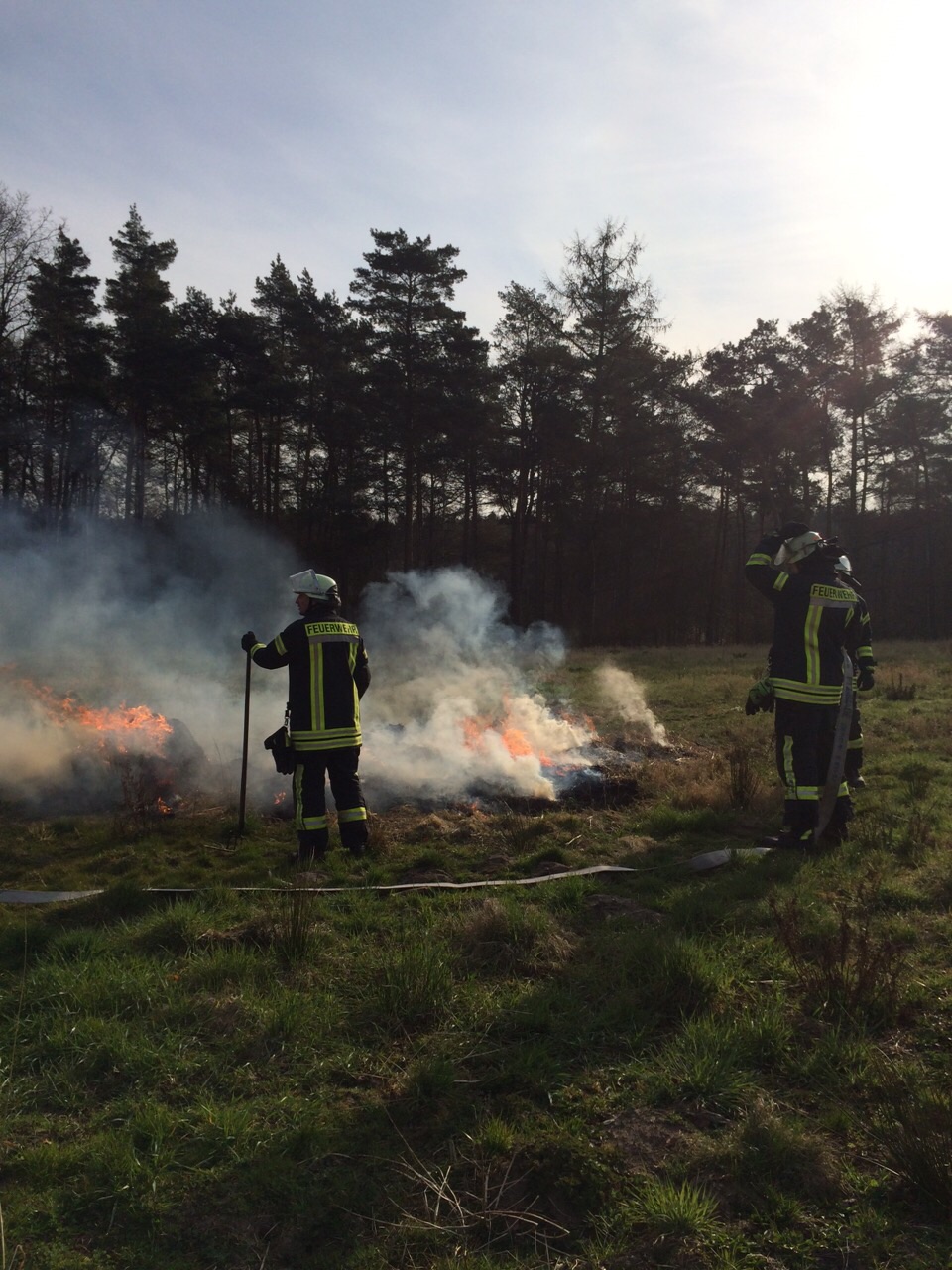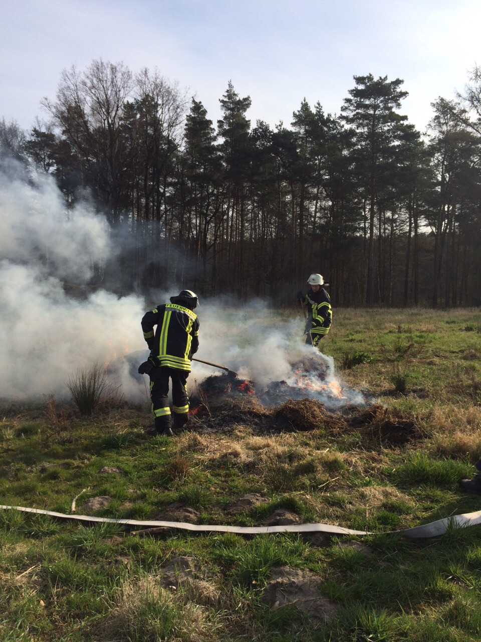 Die Anfahrt zur Einsatzstelle war jedoch deutlich schwieriger, als gedacht. Sämtliche Zufahrtswege zur Brandstelle in der Nähe des Trimm-Dich-Platzes Birkenhain waren durch umgestürzte Bäume versperrt. Erst ein großer Umweg über Neukloster und den Neukloster-Forstweg führte schließlich aus westlicher Richtung zum Brandobjekt. Vor Ort konnten die Reste des Kleinfeuers nach Herstellung der Wasserversorgung schließlich recht schnell abgelöscht werden. Glücklicherweise war es Dank des noch feuchten Bodens nicht zu einer Ausbreitung des Brandes gekommen.