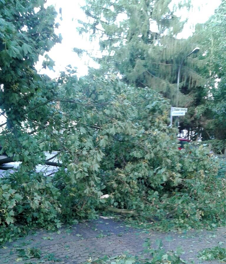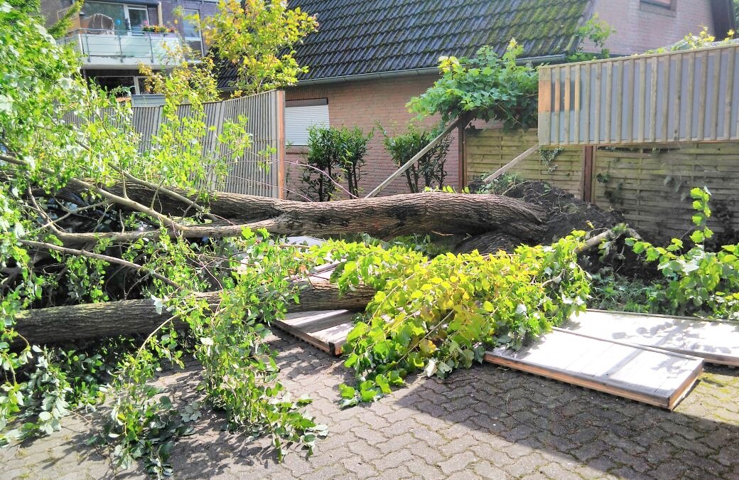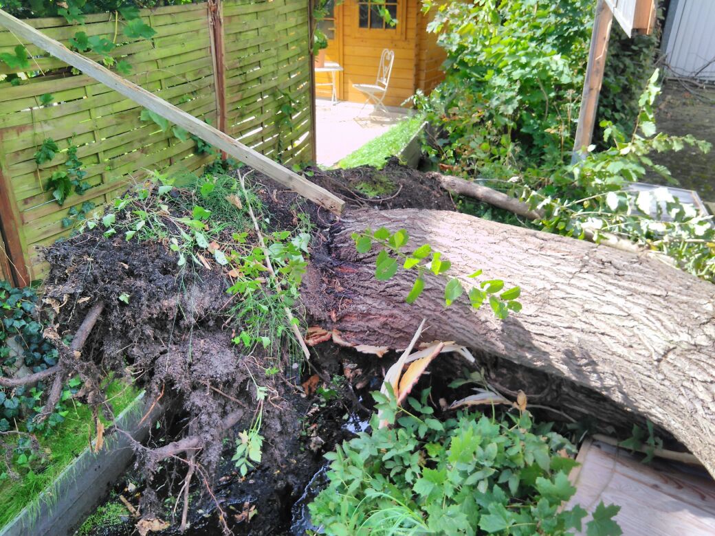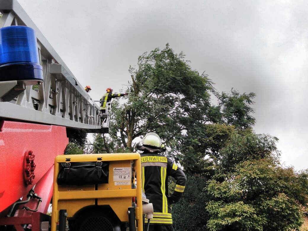 Im Kälberweideweg drohte eine Markise wegzuwehen. Zusätzlich drohte ein großer Baum umzustürzen. Hier wurde durch die Kräfte vom Zug I Abhilfe geleistet.