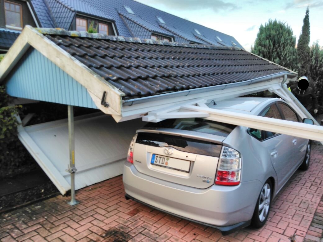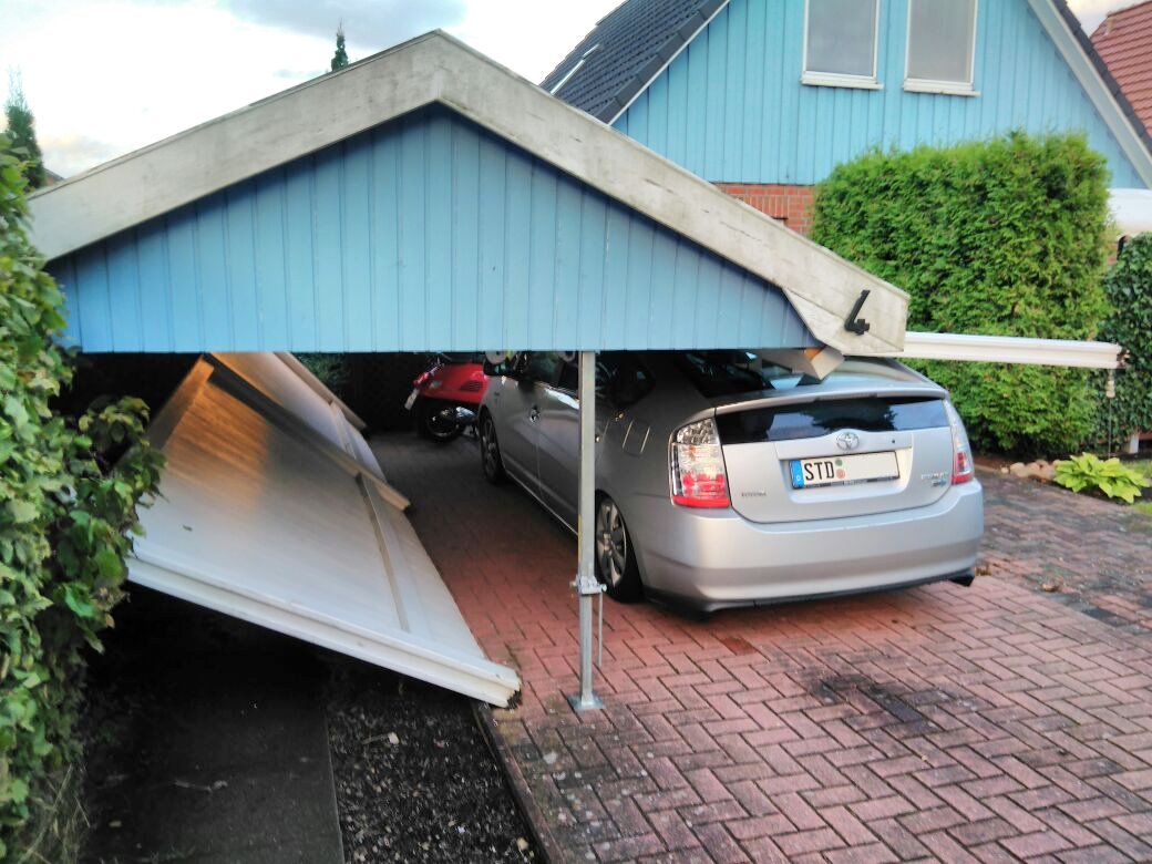 Gegen 19:00 Uhr wurden die Einsatzkräfte in die Käthe-Hamann-Straße alarmiert. Dort hatte ein Carport durch die seitliche Windlast nachgegeben und war in sich zusammengestürzt. Ein Motorroller und ein PKW wurden dabei beschädigt. Die Einsatzkräfte vom Zug I & II sicherten den Carport, um die Fahrzeuge entfernen zu können.
