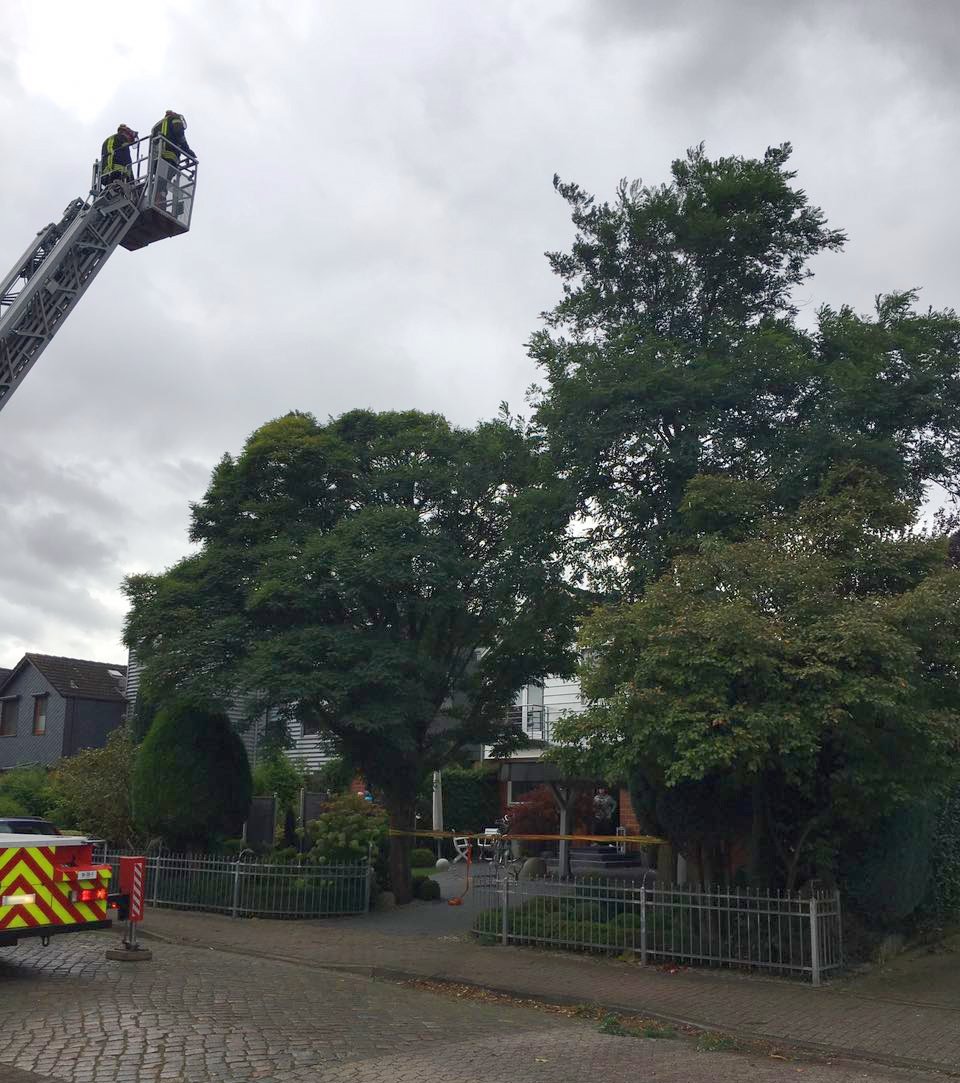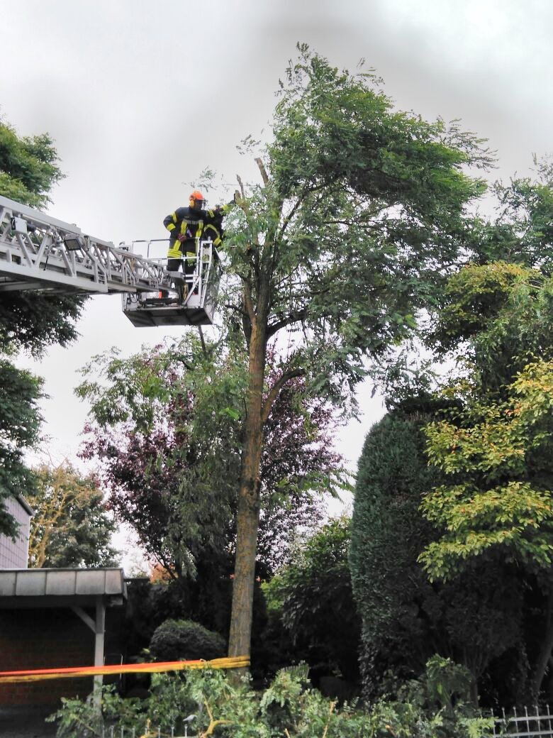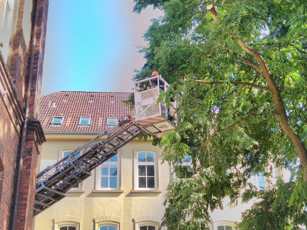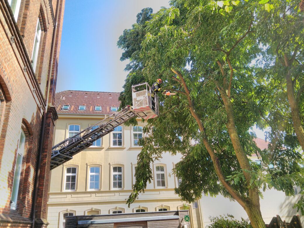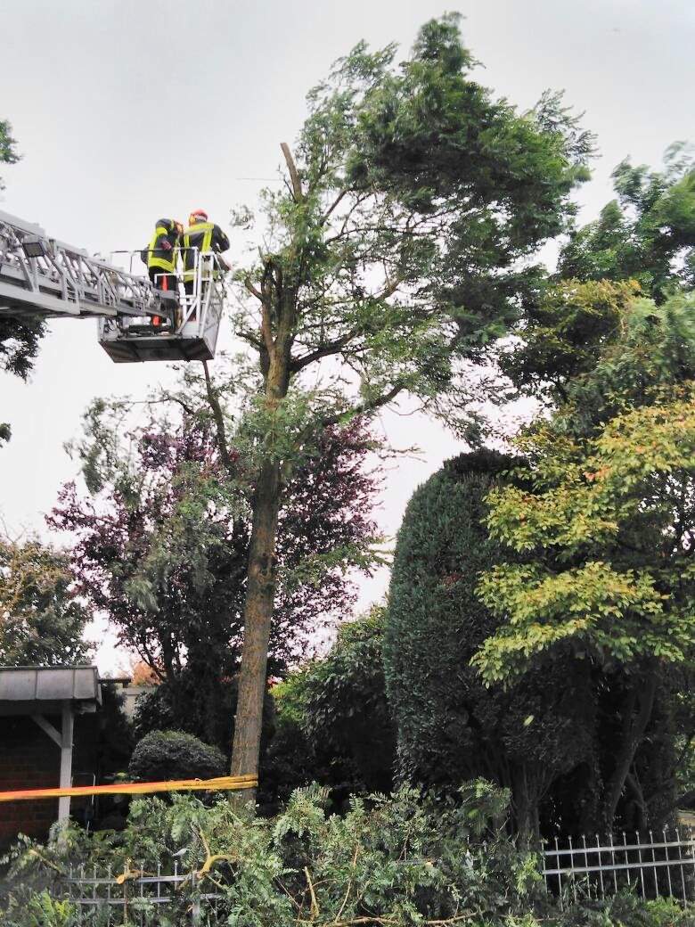 "Hinter der Linah" drohte ein großer Baum auf ein Wohnhaus zu stürzen. Von der Drehleiter aus wurde der Baum gefällt.
