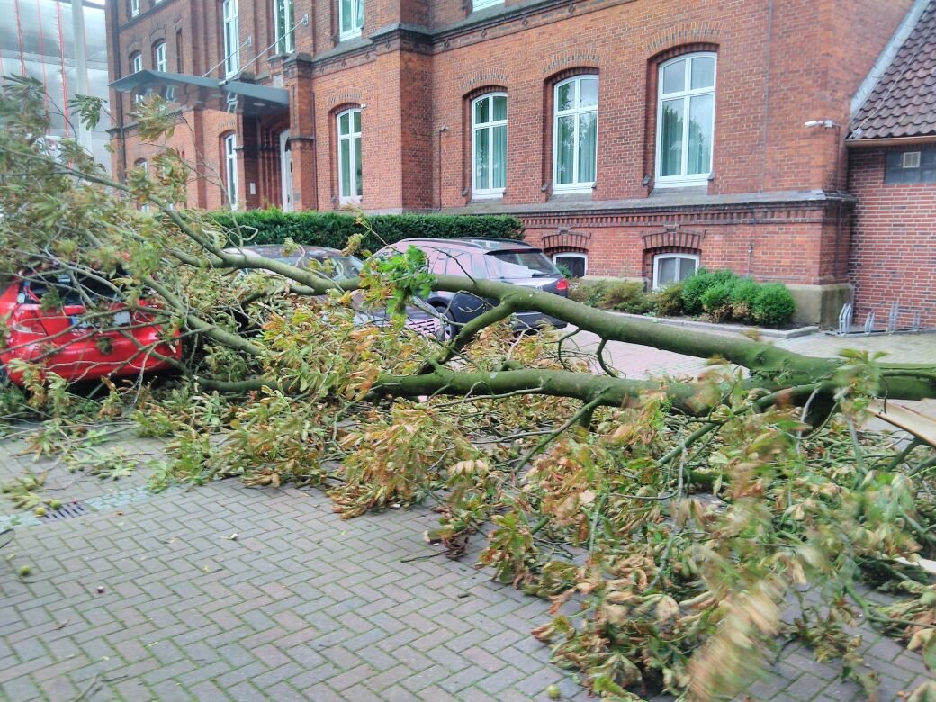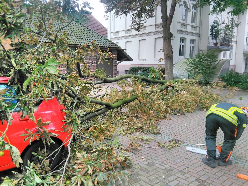 Der erste Einsatz erreichte die Einsatzkräfte vom Zug I der Ortsfeuerwehr Buxtehude gegen 13:00 Uhr. Auf dem Parkplatz eines Hotels in der Harburger Straße war ein Teil einer Kastanie auf mehrere Fahrzeuge gestürzt. Die eingesetzten Kräfte entfernten die betroffenen Baumteile und sperrten den Parkplatz ab. Auf dem benachbarten Grundstück der Grundschule musste ebenfalls ein Baum ausgeschnitten werden, da Teile herabzustürzen drohten.