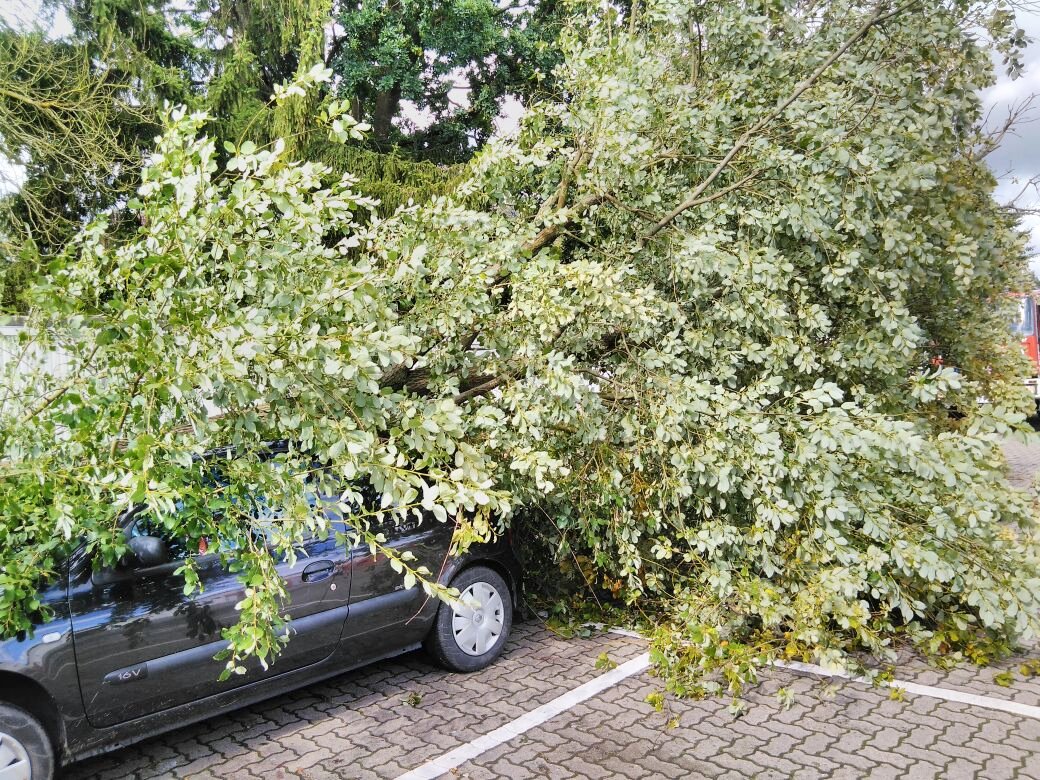 Im Westmoor war auf Höhe der Orchideenstraße eine Birke umgestürzt. Die Krone wurde durch die Kräfte vom Zug I entfernt und beiseite gelegt. Wenig später ging es dann in die Poststr. Auf dem Parkplatz eines Supermarktes war ein Baum auf einen PKW gefallen.