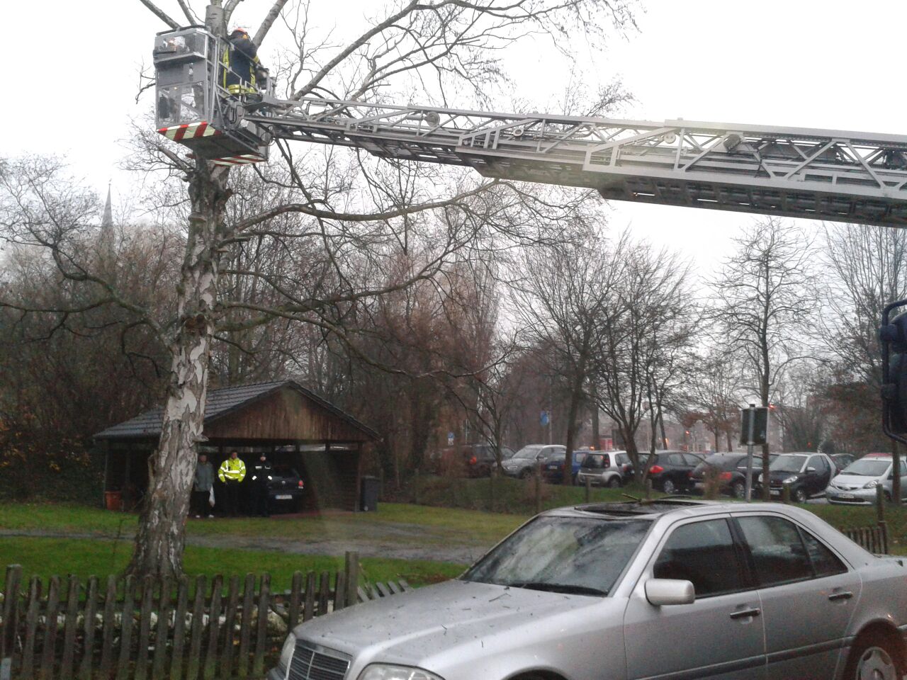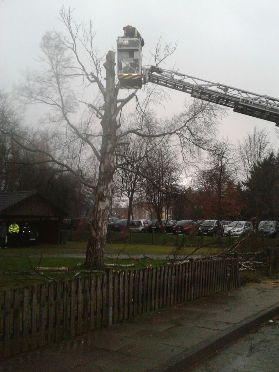 Zur Beseitigung der Gefahrenstelle wurde der Zug I der Ortsfeuerwehr Buxtehude alarmiert, der mit Hilfe der Drehleiter den Baum heruntersägte und die gefallene Krone zerlegte.