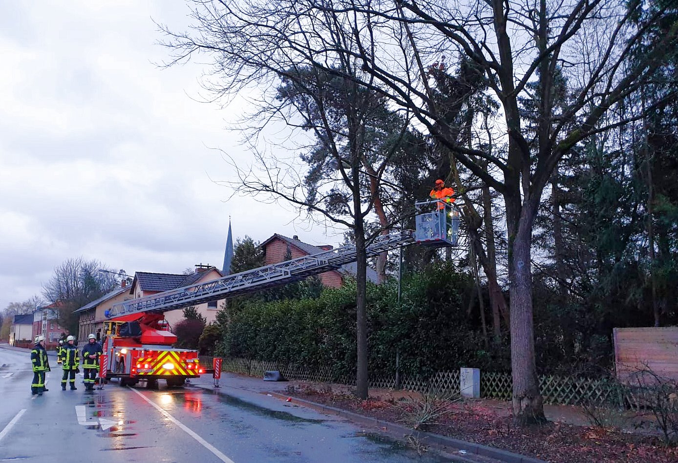 Die alarmierten Einsatzkräfte vom Zug I der Ortsfeuerwehr Buxtehude rückten mit der Drehleiter aus und sperrten den betroffenen Bereich. Aus dem Drehleiterkorb entfernten die Einsatzkräfte den beschädigten Baum.
