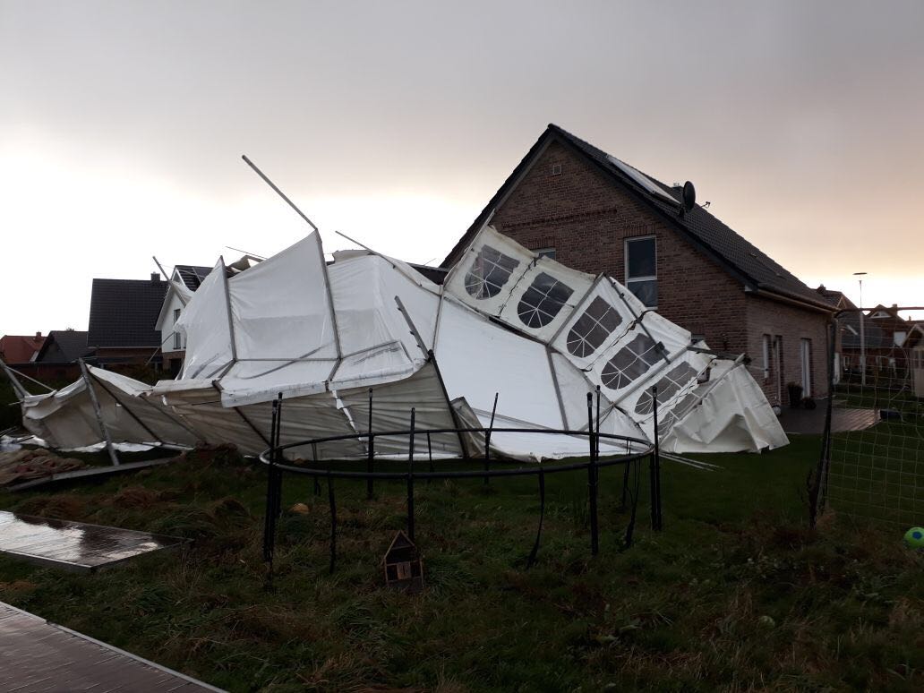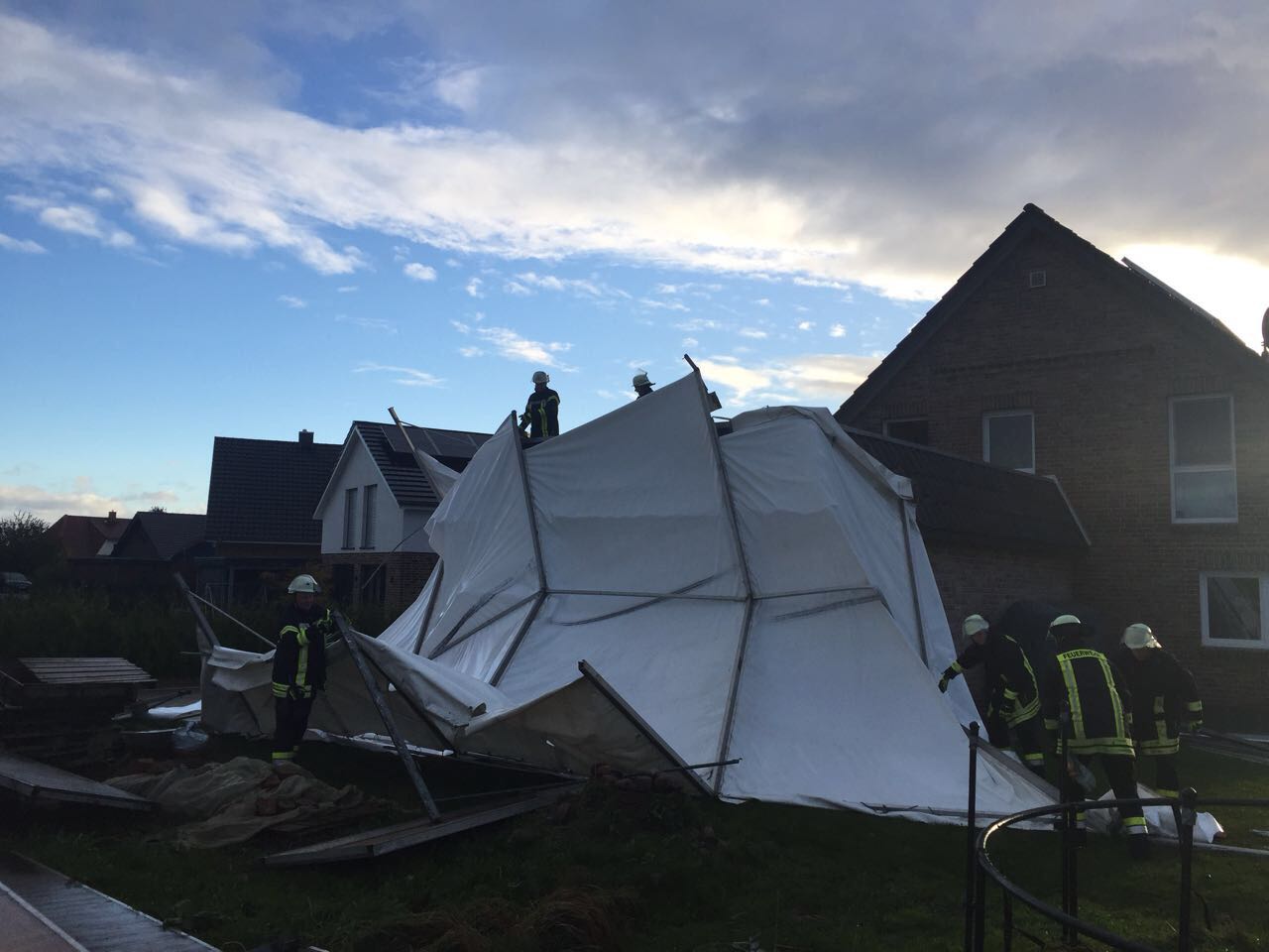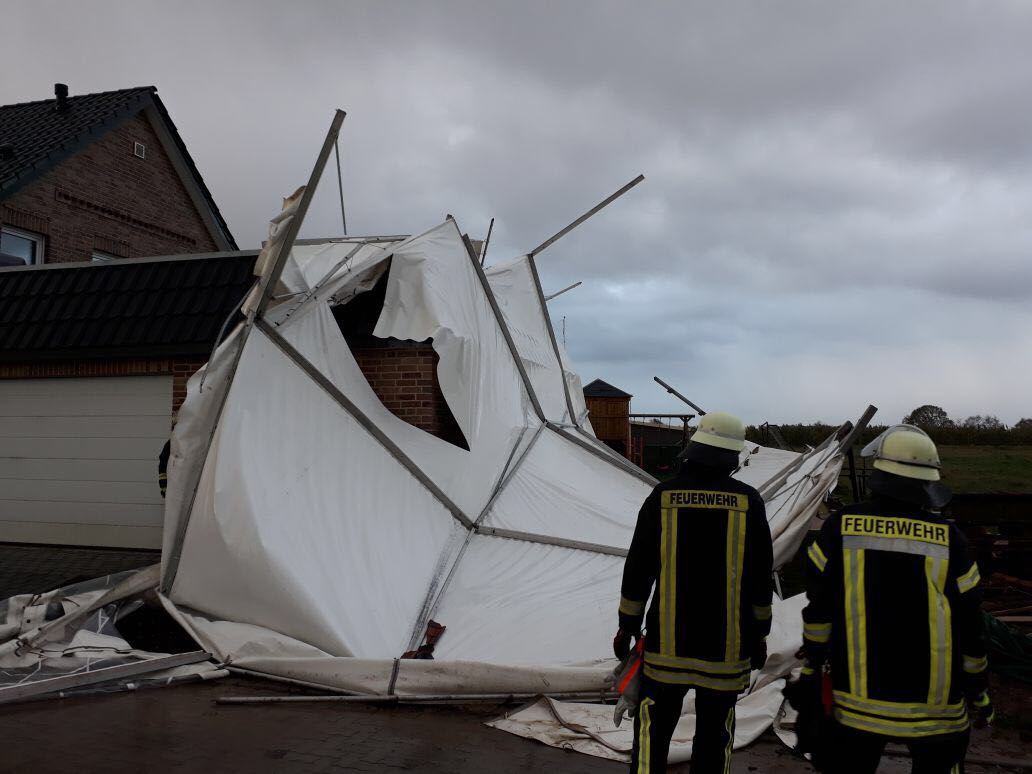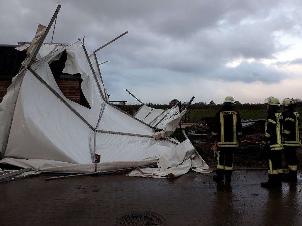 In der Milanstraße war gegen 08:00 Uhr ein etwa 20m² großes Partyzelt weggeweht und lag nun auf einer angrenzenden Garage. Die Einsatzkräfte der Ortsfeuerwehr Ottensen räumten die zerstörten Zeltteile beiseite.