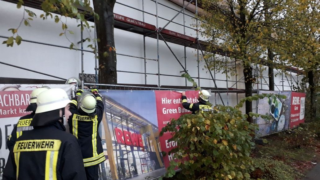 An der Hochschule 21 drohten die Gerüstplanen der Einrüstung wegzuwehen. Der Hausmeister sicherte die Gefahrenstelle, nachdem die Ortsfeuerwehr Ovelgönne / Ketzendorf vor Ort war.