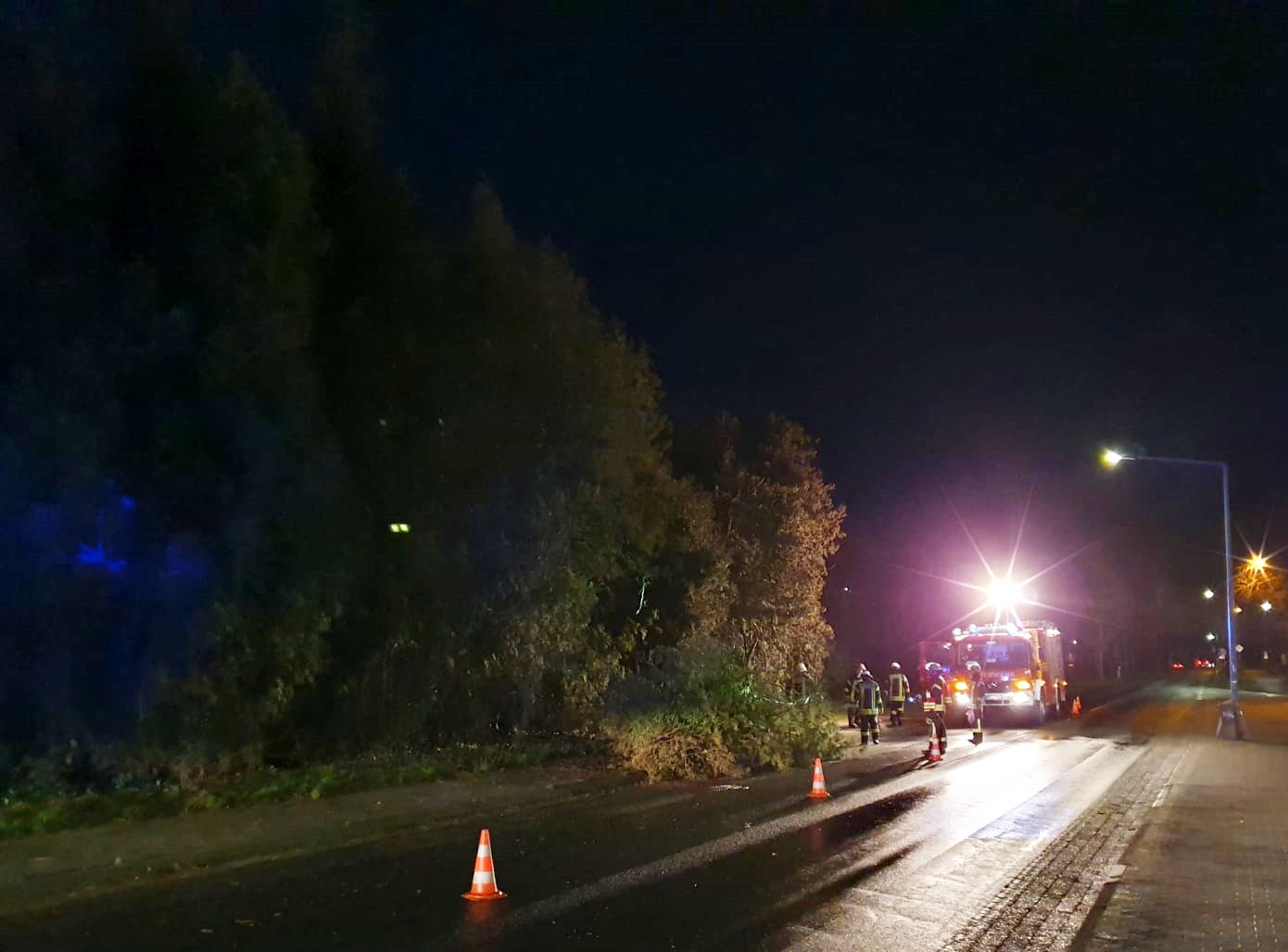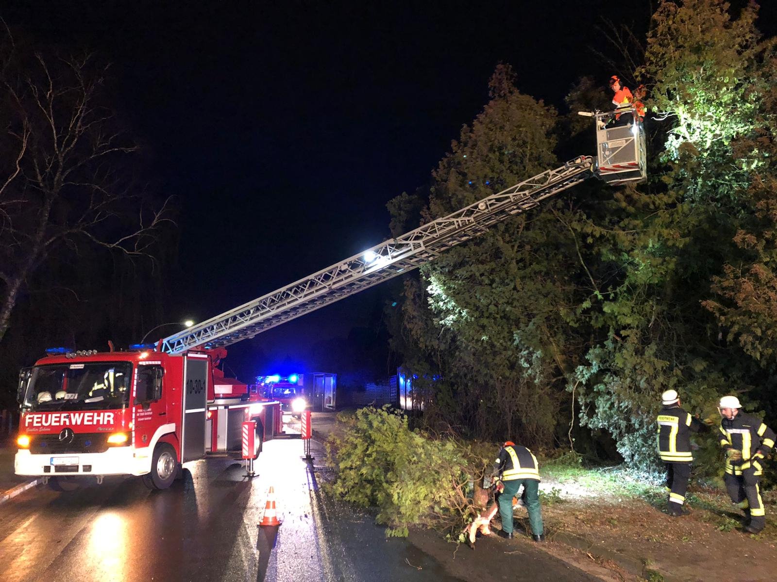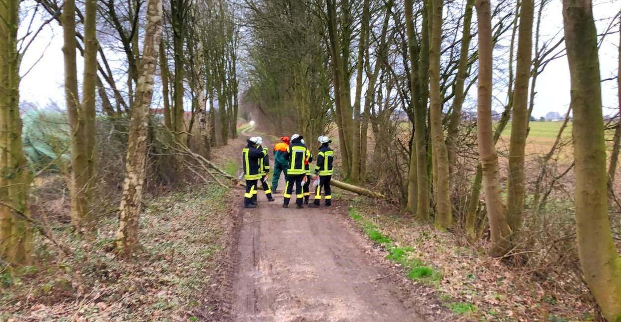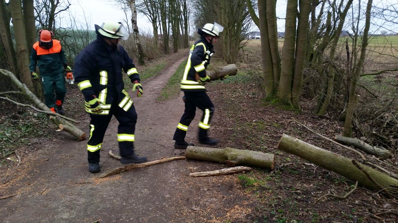 Knapp eine Stunde später war es die Ortsfeuerwehr Ottensen, die am Heideweg den ersten umgestürzten Baum entfernen musste. Ein weiterer Baum mit abgebrochener Krone wurde an gleicher Stelle gefällt.