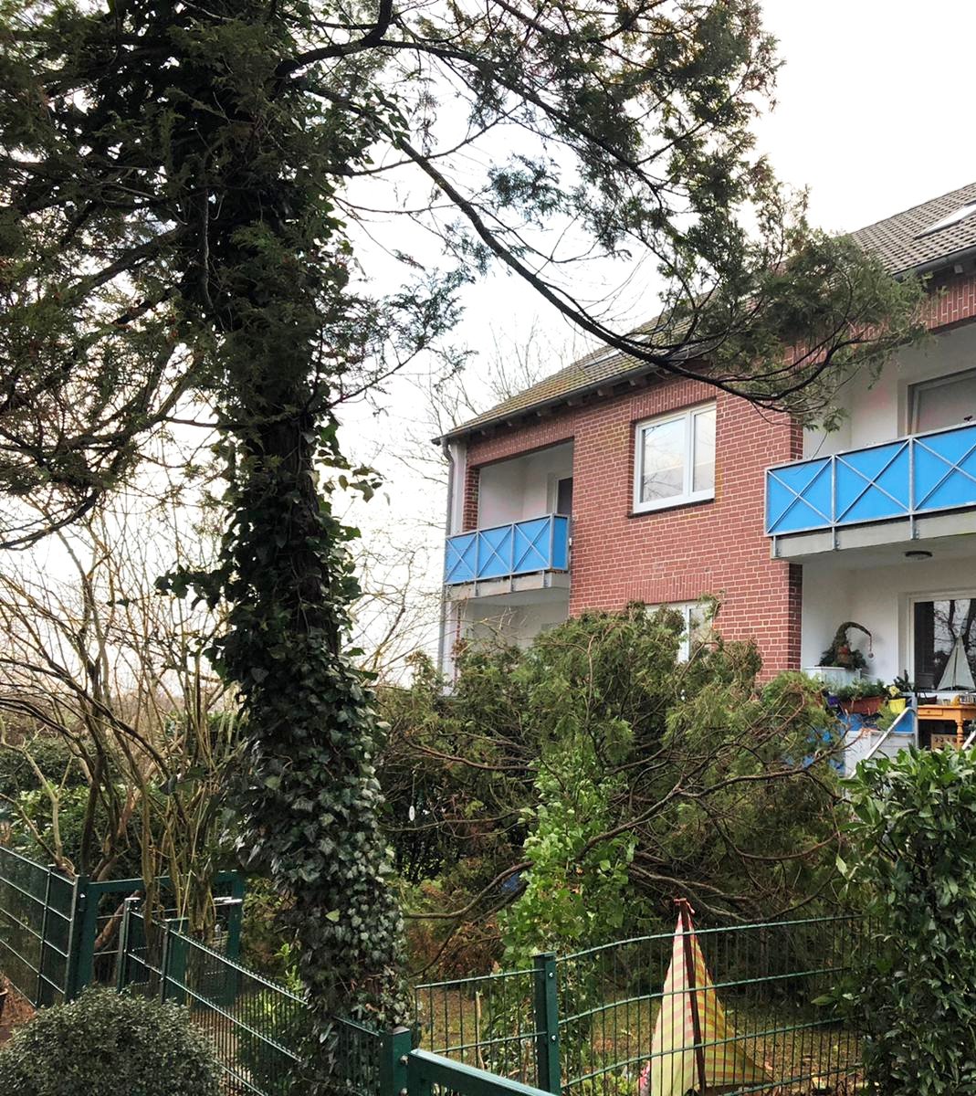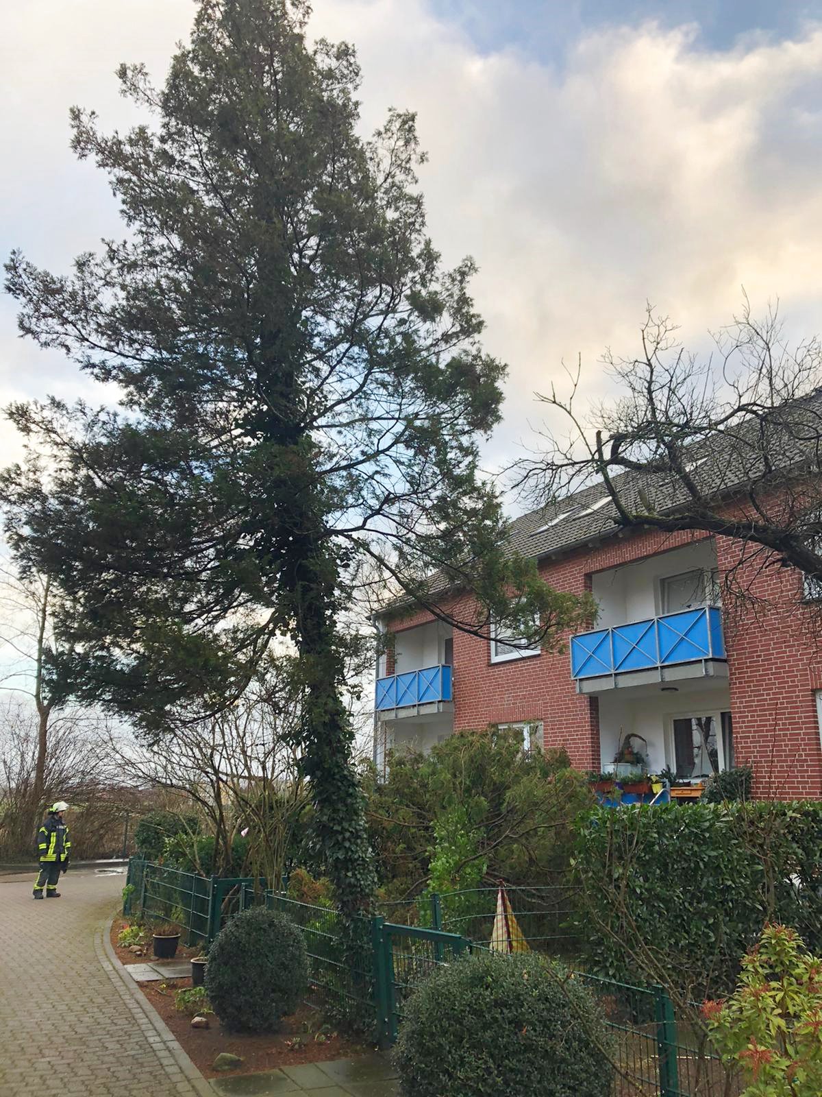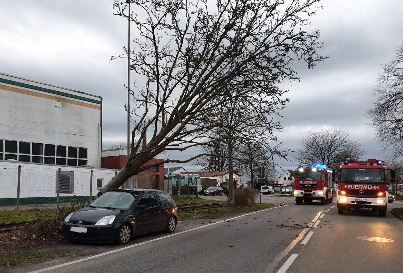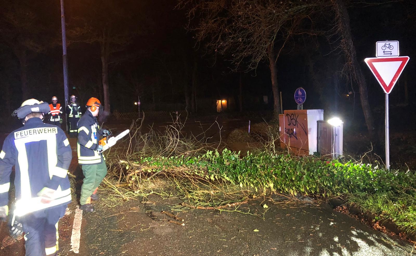 Knapp eine Stunde später war es die Ortsfeuerwehr Ottensen, die am Heideweg den ersten umgestürzten Baum entfernen musste. Ein weiterer Baum mit abgebrochener Krone wurde an gleicher Stelle gefällt.