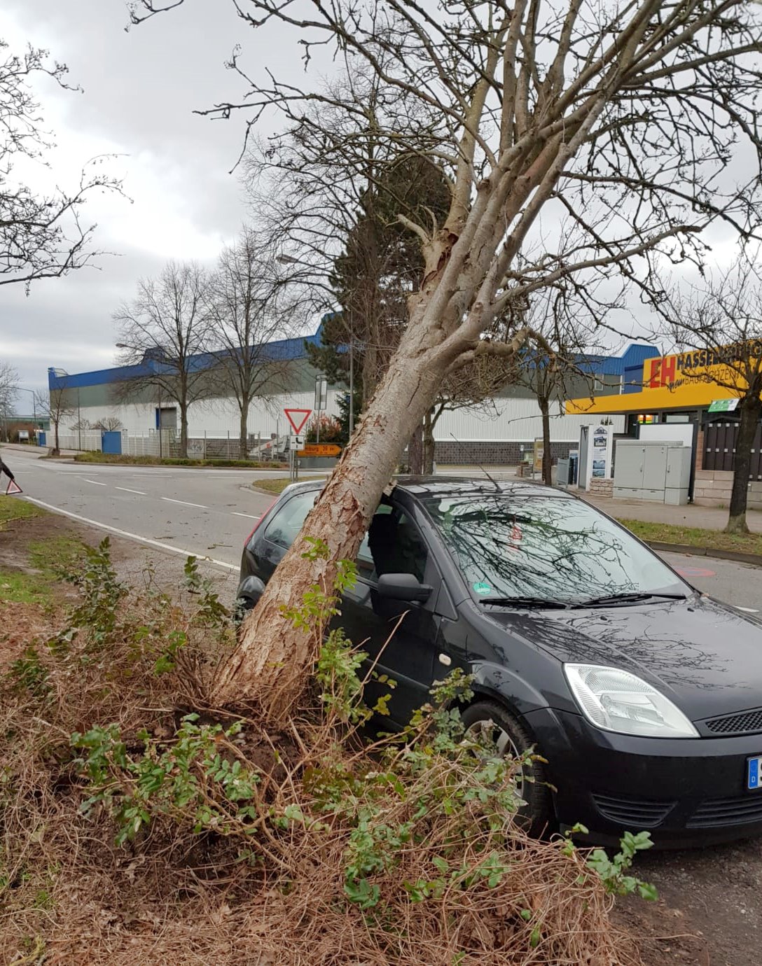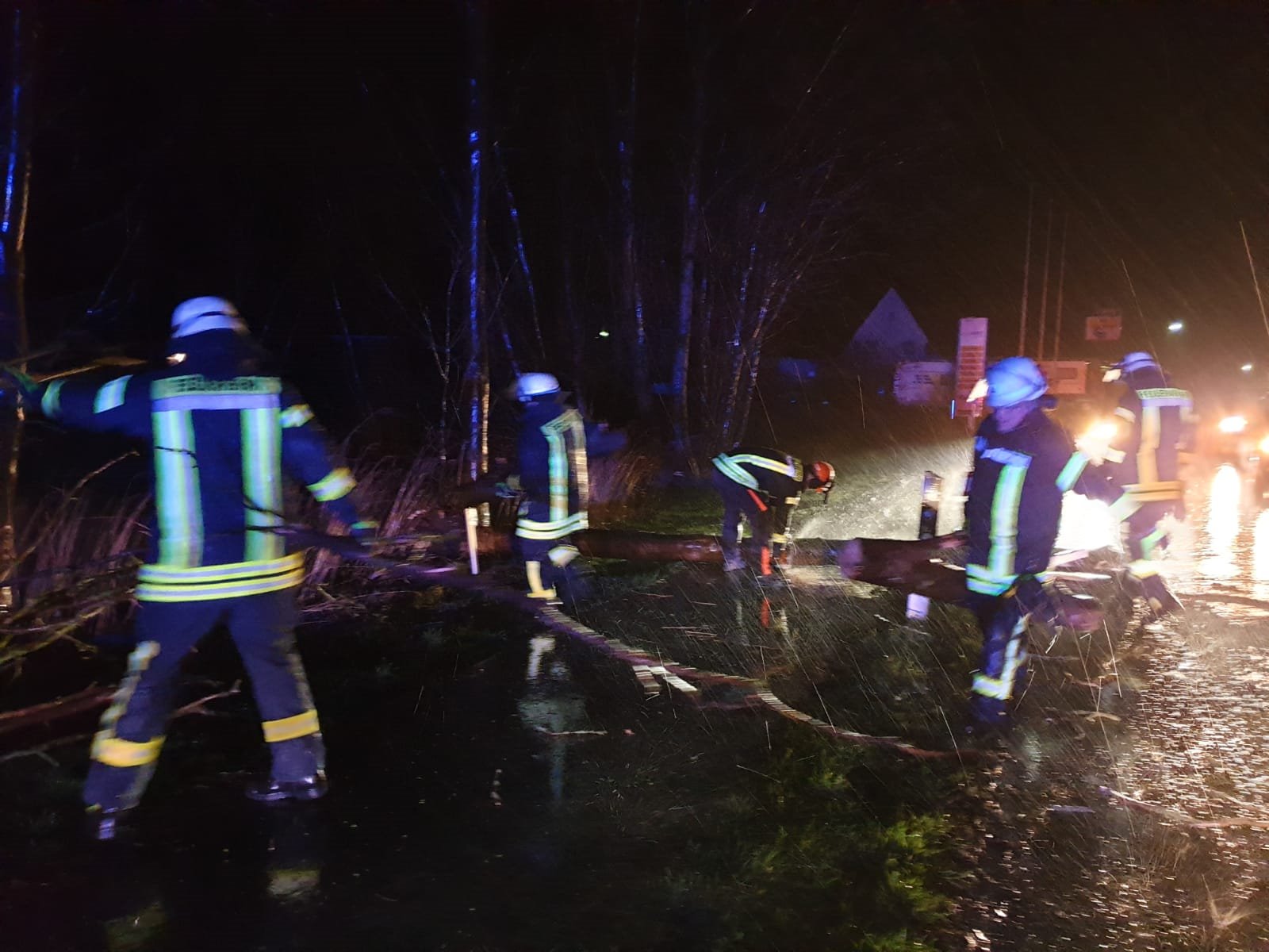 Während in der Nacht keine Einsätze zu verzeichnen waren, ging es am Montagmorgen mit mehreren umgestürzten Bäumen weiter. Im Holunderweg musste ein etwa 30cm dicker Baum von der Fahrbahn entfernt werden. In der Sachsenbergstraße drohte eine Tanne auf ein Wohnhaus zu stürzen, nachdem ein nahestehender Baum bereits gefallen war und das Erdreich gelockert hatte. Die Züge I & II waren dort im Einsatz.
