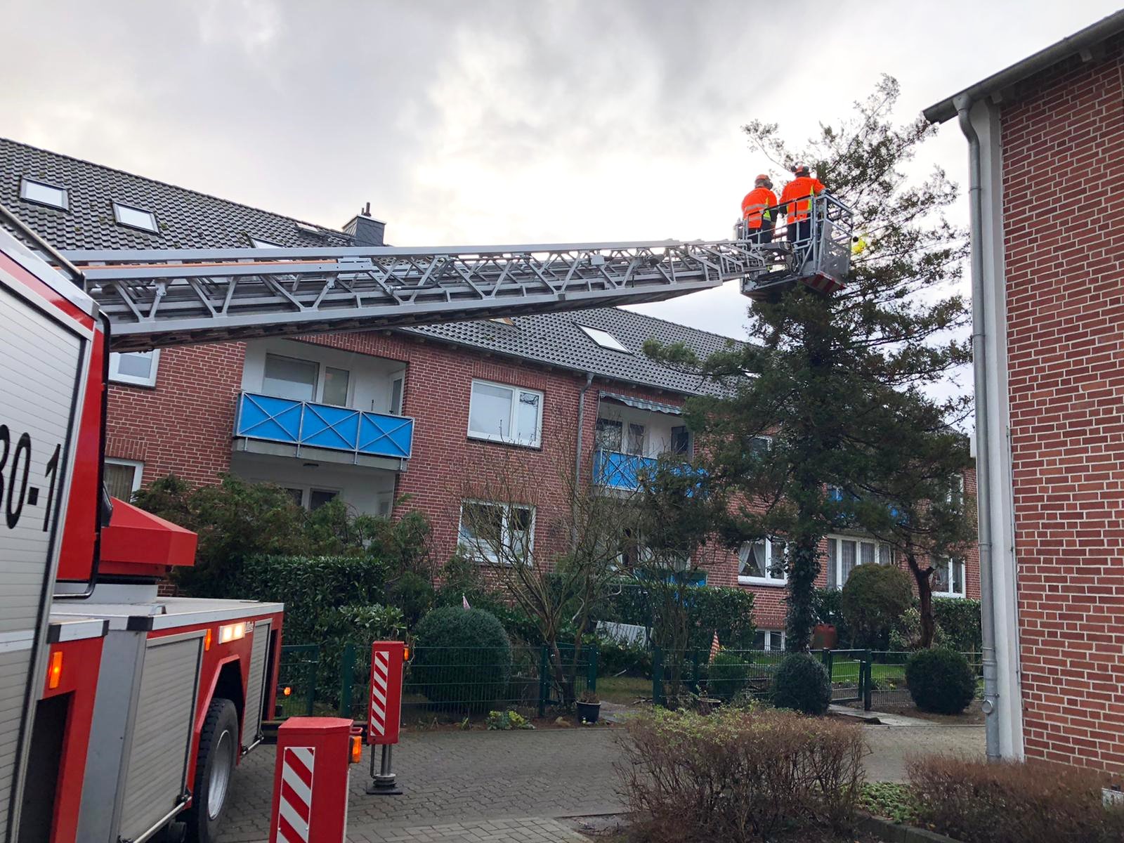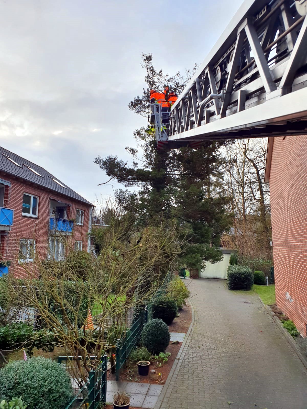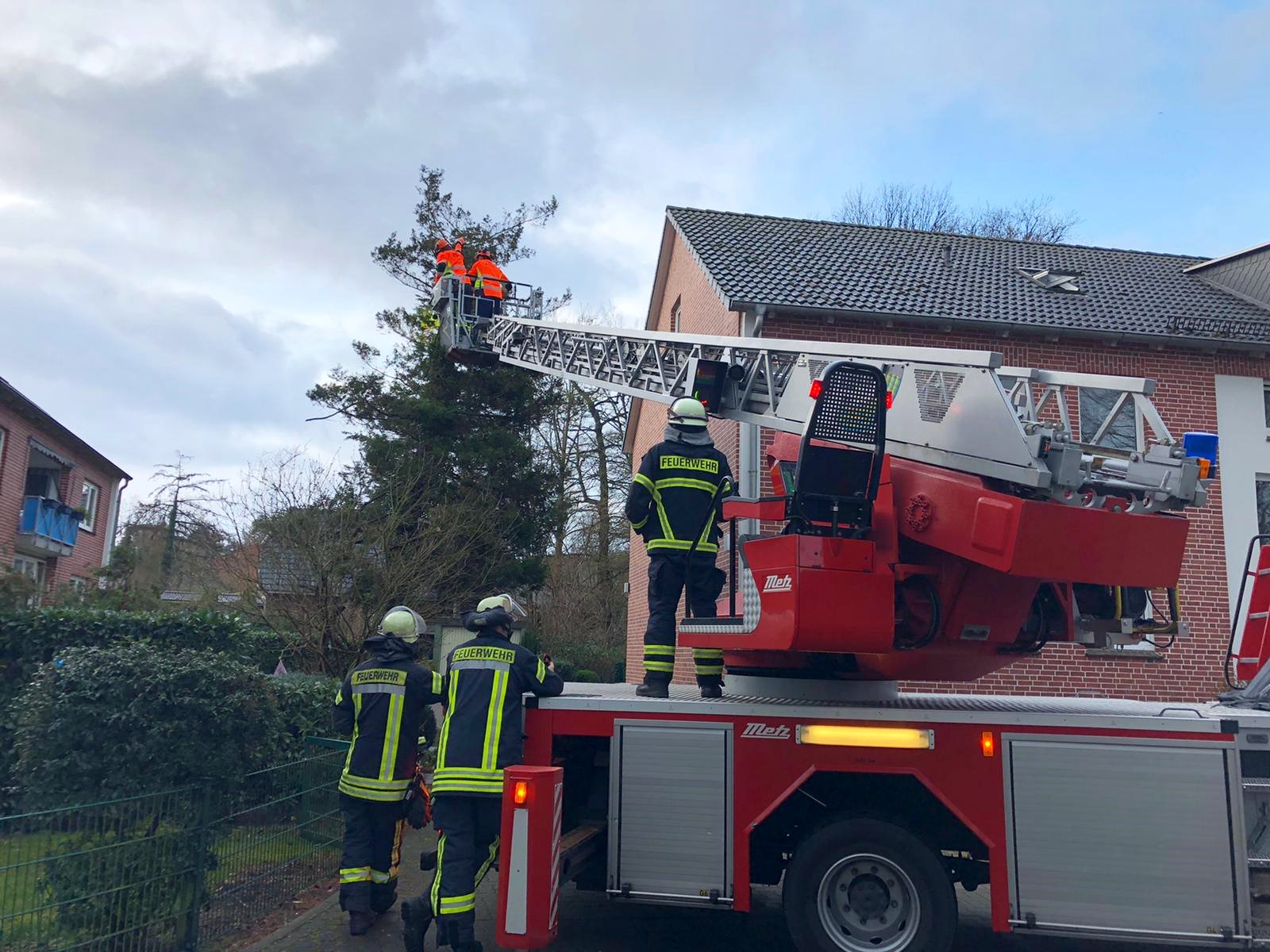 Als letzten Sturmeinsatz ging es für die Drehleiter in die Straße "Beim Kloster Dohren". Dort waren Dachziegel vom Dach gefallen. Eine weitere Pfanne wurde von der Drehleiter entfernt. Den Rest übernahm ein hinzugezogener Dachdecker.