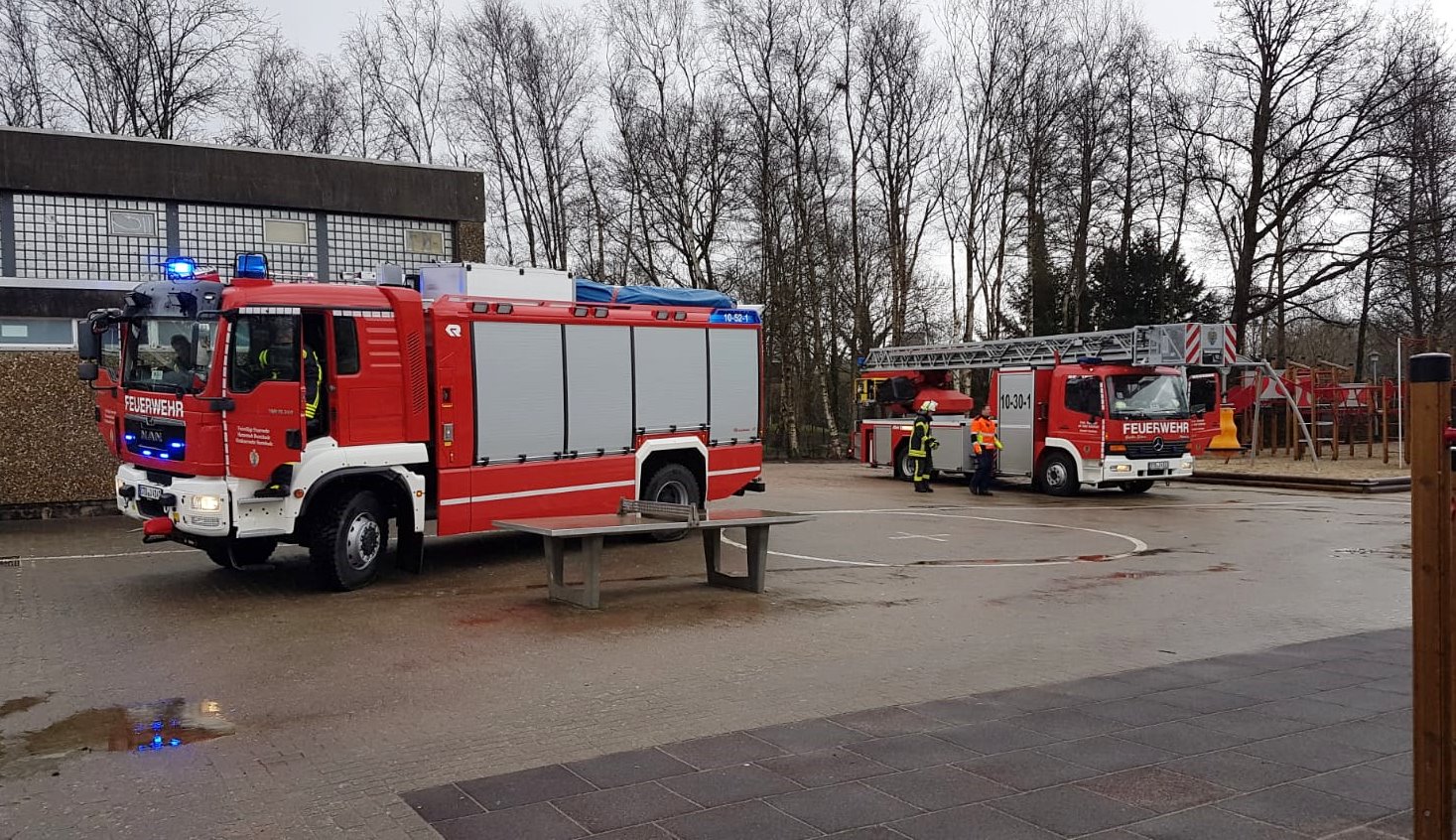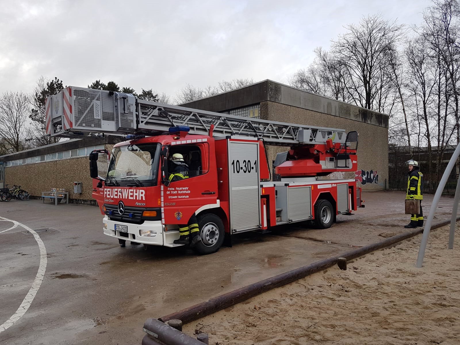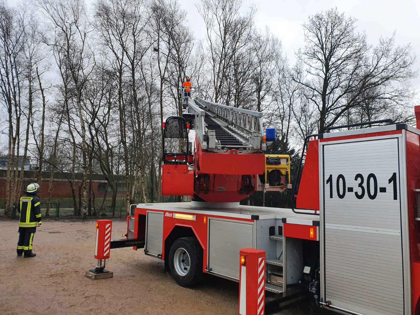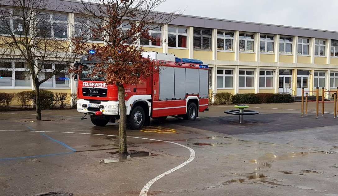 An der Rotkäppchenschule musste die Drehleiter am Mittag eingesetzt werden. Ein Baum war abgeknickt und drohte abzustürzen.