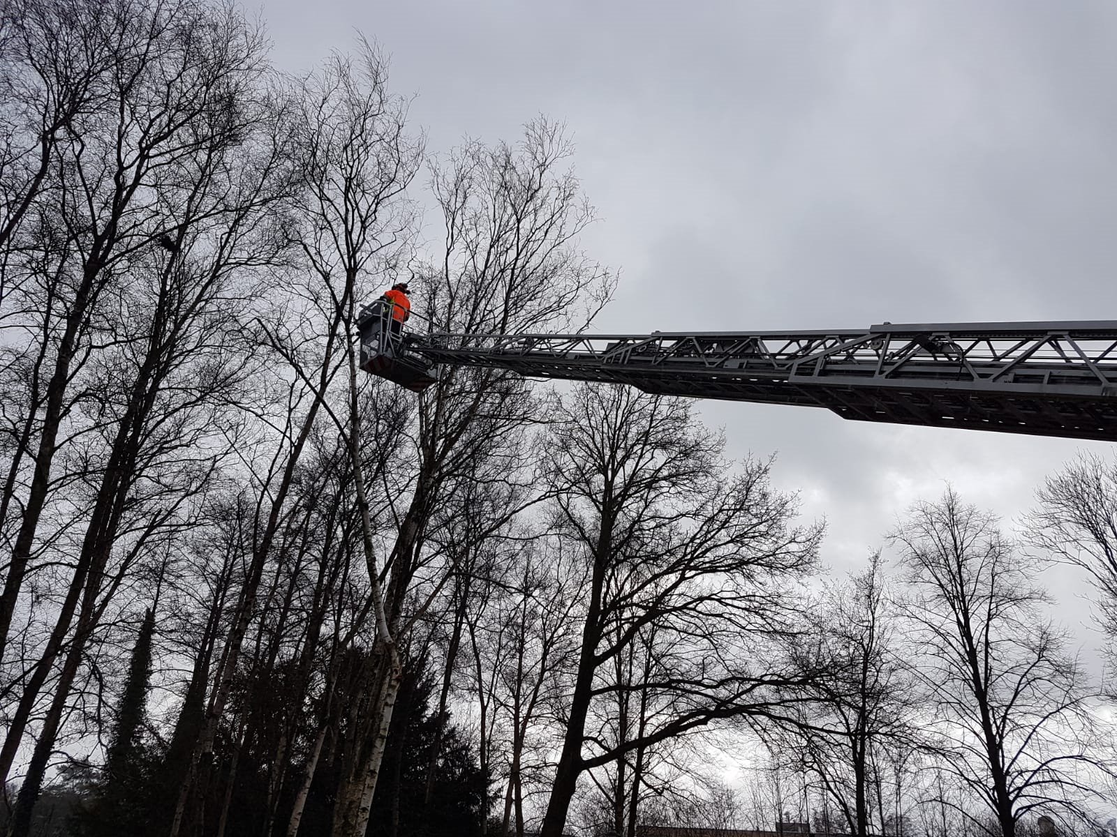 Im Alten Postweg war ein Straßenbaum abgebrochen und lehnte an einem dort parkenden Fahrzeug. Behutsam wurde der Baum von der Drehleiter aus abgetragen.