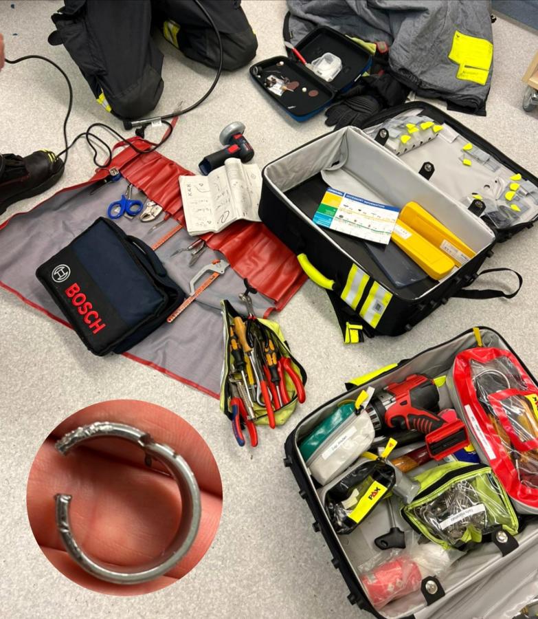 Die Feuerwehrkräfte brachten eine große Menge Werkzeuge in die Notaufnahme und setzten letztendlich einen Miniatur-Winkelschleifer ein, mit dem es gelang einen weiteren Schnitt zu setzen und den Ring zu weiten.