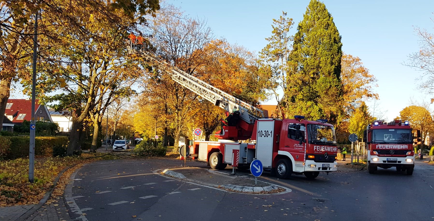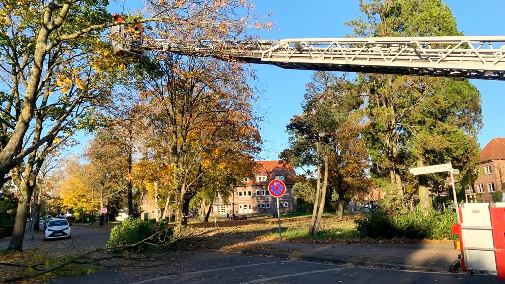 Die alarmierten Einsatzkräfte vom Zug I der Ortsfeuerwehr Buxtehude ließen den LKW langsam vorziehen und entfernten anschließend aus dem Korb der Drehleiter das beschädigte Geäst aus dem Baum.