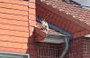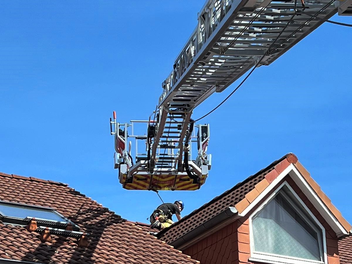 Gesichert mit der Absturzsicherung bestieg ein Feuerwehrmann aus dem Drehleiterkorb das Gebäudedach und konnte das unversehrte Tier aufnehmen und zu Boden bringen.