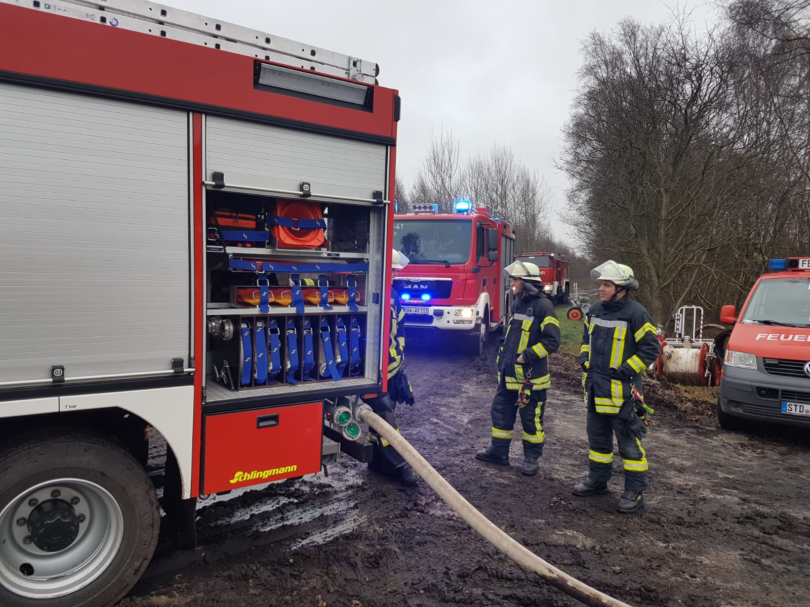 Mit dem Buxtehuder Großtanklöschfahrzeug sollte an der Einsatzstelle ein Wasserpuffer aufgebaut werden. Weitere Tanklöschfahrzeuge fuhren derweil im Pendelverkehr zwischen einem Hydranten am Feuerwehrhaus Sauensiek und der Einsatzstelle im Pendelverkehr, da vor Ort keine Wasserentnahmestelle zur Verfügung stand.