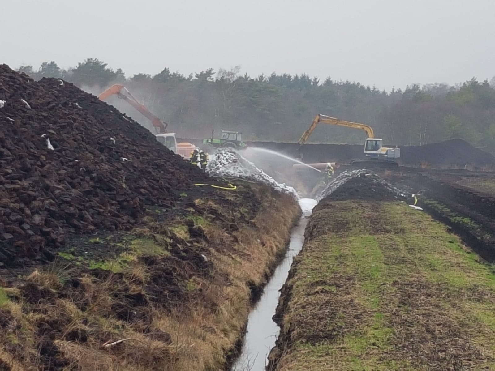 Mit zwei C-Rohren löschten die Einsatzkräfte den brennenden Torf ab, der von einem Bagger aus der Torfmiete ausgehoben wurde. Dem Löschwasser wurde ein Netzmittel zugefügt, um die Oberflächenspannung des Wassers zu brechen, was zu einem tieferen Eindringen in das Brandgut führt.