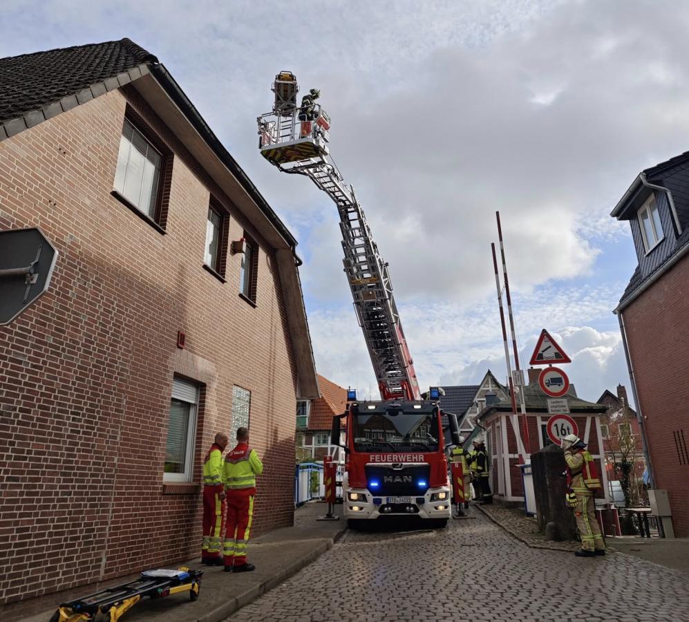 Gemeinsam mit den Einsatzkräften der Ortsfeuerwehr Estebrügge (Gem. Jork) musste die Drehleiter vom Zug I der Ortsfeuerwehr Buxtehude am Mittwochmorgen zu einer Tragehilfe nach Estebrügge ausrücken.