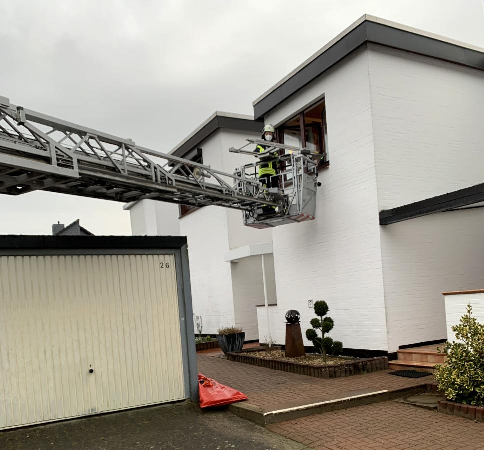 Die alarmierten Kräfte der Ortsfeuerwehr Hedendorf und vom Zug I der Ortsfeuerwehr Buxtehude brachten die Drehleiter in der schmalen Zufahrt zum Haus in Stellung und retteten den Patienten über das Hubrettungsgerät.