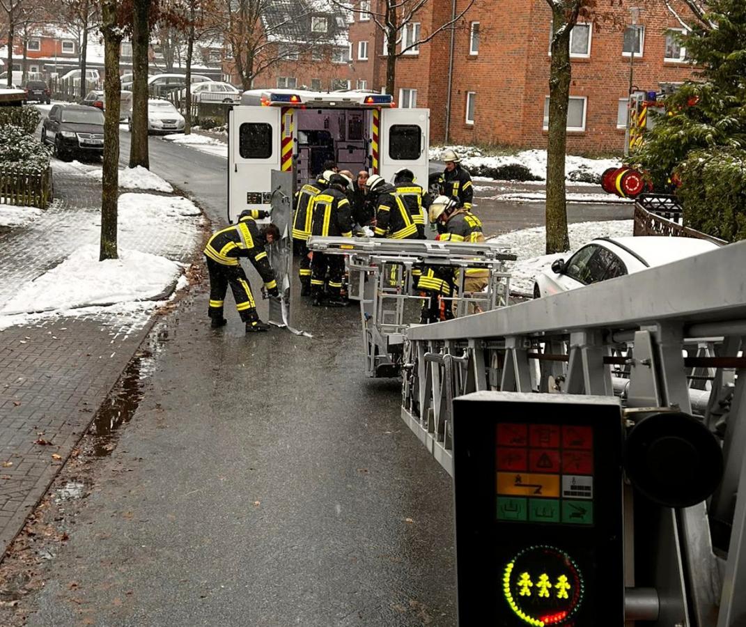 Ein schwerer Sturz in einer Wohnung im Mirabellenweg sorgte am Freitagmittag auch für einen Einsatz der Ortsfeuerwehr Buxtehude. Um die Patientin aus ihrer Wohnung im dritten Obergeschoss eines Mehrfamilienhauses zum bereitstehenden Rettungswagen zu transportieren, war eine möglichst schonende Rettung notwendig, so dass der Rettungsdienst die Buxtehuder Drehleiter nachforderte.