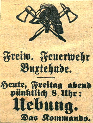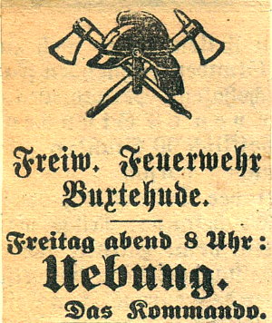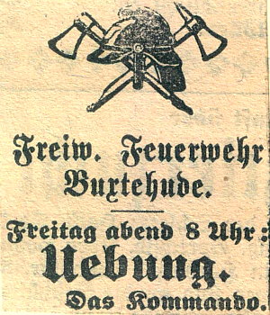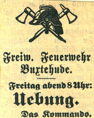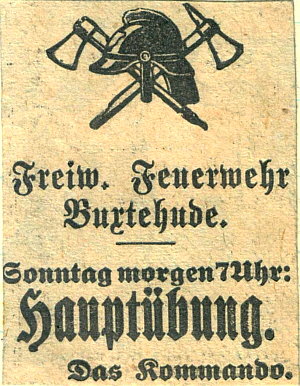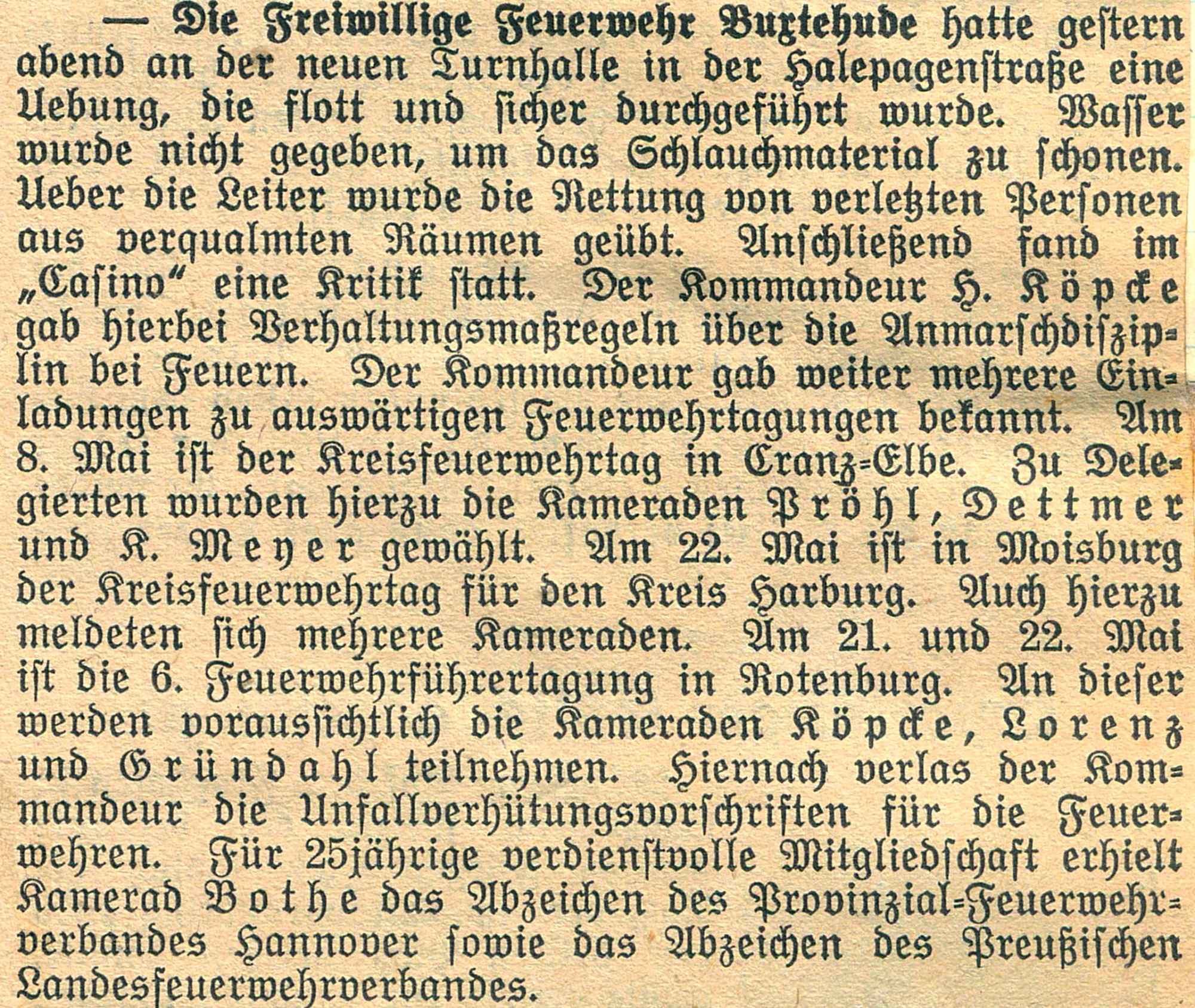 Vor knapp 90 Jahren, als es in den Zeitungen noch kaum Bilder gab und das Buxtehuder Tageblatt in einer komplett anderen Aufmachung erschien, war die Buxtehuder Feuerwehr regelmäßiger Gast in den Lokalseiten. Es wurden nicht nur von den damals noch recht wenigen Einsätzen berichtet. Einen großen Anteil an den damaligen Berichten machten auch die Artikel über die Übungsabende der Buxtehuder Feuerwehr aus. Auch zu den Dienstabenden wurde mit einer kleinen Anzeige eingeladen. Es scheint, dass damals ein Journalist des Tageblatts regelmäßiger Gast bei den Übungsdiensten war.