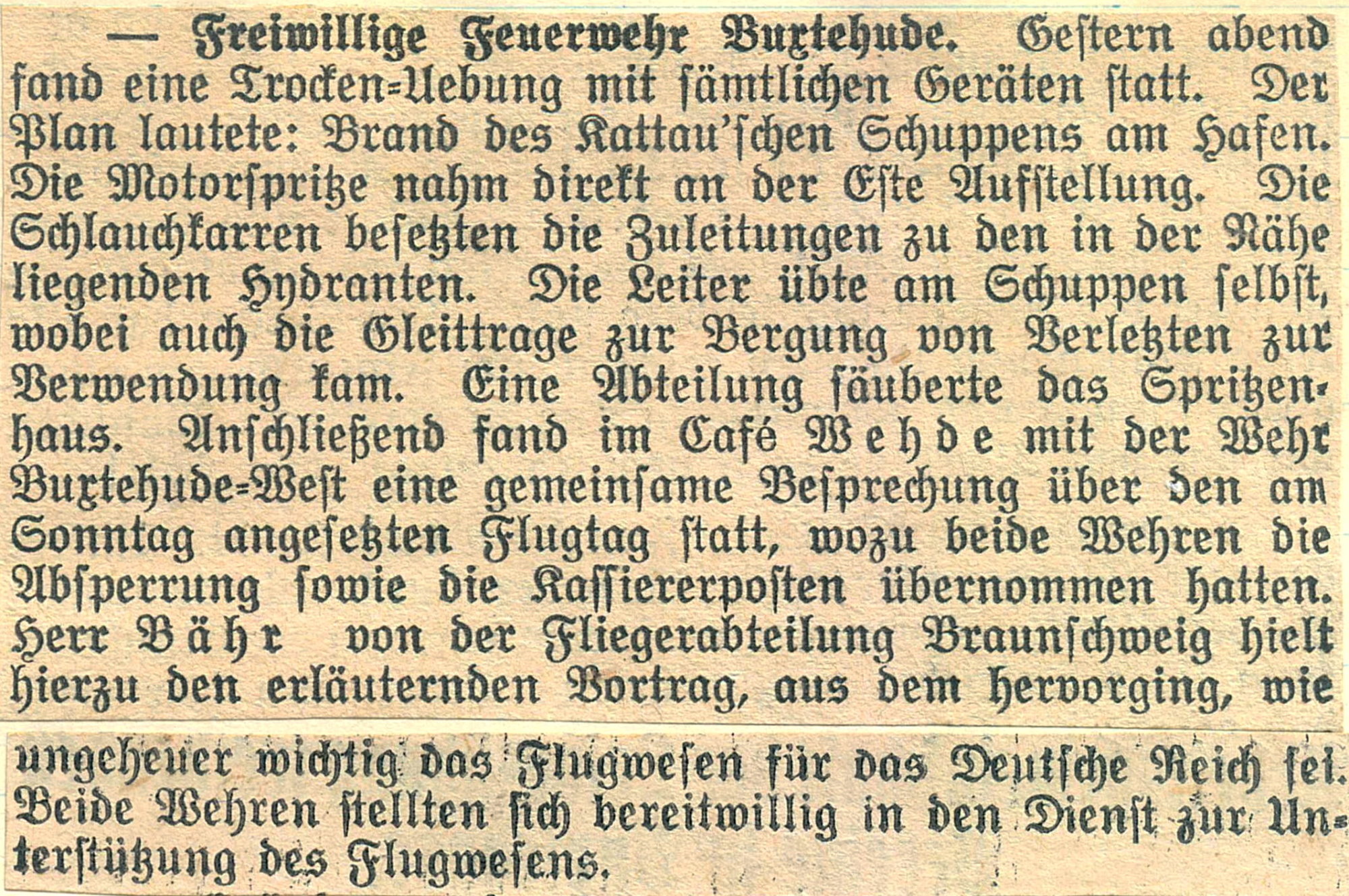 Anschließend fand im Café Wehde mit der Wehr Buxtehude-West eine gemeinsame Besprechung über den am Sonntag angesetzten Flugtag statt, wozu beide Wehren die Absperrung sowie die Kassiererposten übernommen hatten. Herr Bähr von der Fliegerabteilung Braunschweig hielt hierzu den erläuternden Vortrag, aus dem hervorging, wie ungeheuer wichtig das Flugwesen für das Deutsche Reich sei. Beide Wehren stellten sich bereitwillig in den Dienst zu Unterstützung des Flugwesens.