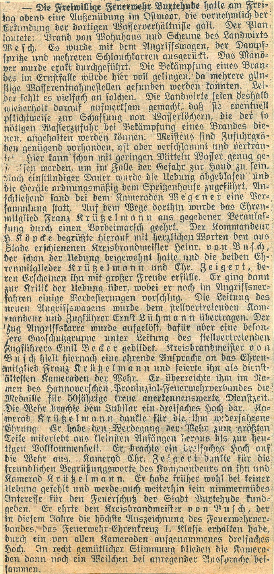 Nach einstündiger Dauer wurde die Übung abgeblasen und die Geräte ordnungsmäßig dem Spritzenhause zugeführt. Anschließend fand bei dem Kameraden Wegener eine Versammlung statt. Auf dem Wege dorthin wurde das Ehrenmitglied Franz Krützelmann aus gegebener Veranlassung durch einen Vorbeimarsch geehrt. Der Kommandeur H. Köpke begrüßte hierauf mit herzlichen Worten den aus Stade erschienenen Kreisbrandmeister Heinr. von Busch, der schon der Übung beigewohnt hatte und die beiden Ehrenmitglieder Krützelmann und Chr. Zeigert, deren Erscheinen ihn mit großer Freude erfülle.