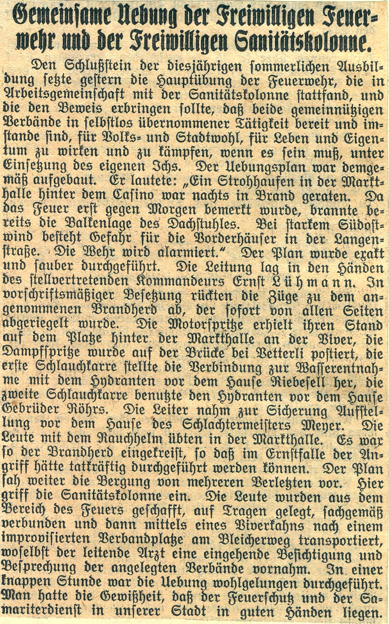 Den Schlußstein der diesjährigen sommerlichen Ausbildung setzte gestern die Hauptübung der Feuerwehr, die in Arbeitsgemeinschaft mit der Sanitätskolonne stattfand, und die den Beweis erbringen sollte, daß beide gemeinnützigen Verbände in selbstlos übernommener Tätigkeit bereit und imstande sind, für Volks- und Stadtwohl, für Leben und Eigentum zu wirken und zu kämpfen, wenn es sein muß, unter Einsetzung des eigenen Ichs. Der Uebungsplan war demgemäß aufgebaut. Er lautete: "Ein Strohhaufen in der Markthalle hinter dem Casino war nachts in Brand geraten. Da das Feuer erst gegen Morgen bemerkt wurde, brannte bereits die Balkenlage des Dachstuhls. Bei starkem Südostwind besteht die Gefahr für die Vorderhäuser in der Langen Straße. Die Wehr wird alarmiert." Der Plan wurde exakt und sauber durchgeführt. Die Leitung lag in den Händen des stellvertretenden Kommandeurs Ernst Lühmann. In der vorschriftsmäßiger Besetzung rückten die Züge zu dem angenommenen Brandherd ab, der sofort von allen Seiten abgeriegelt wurde.