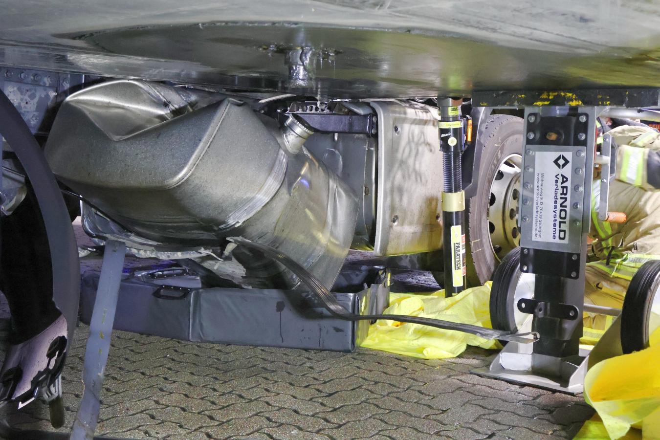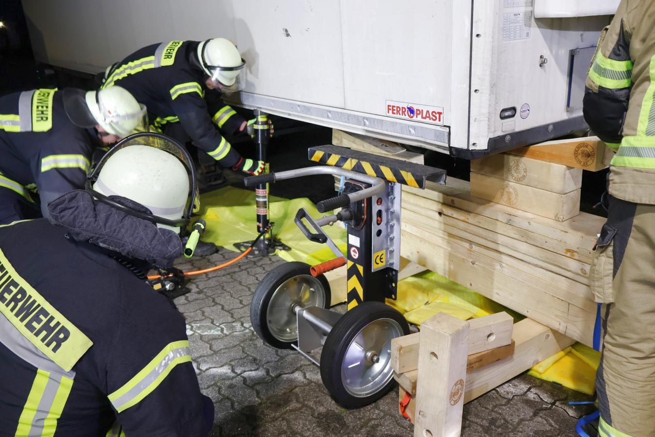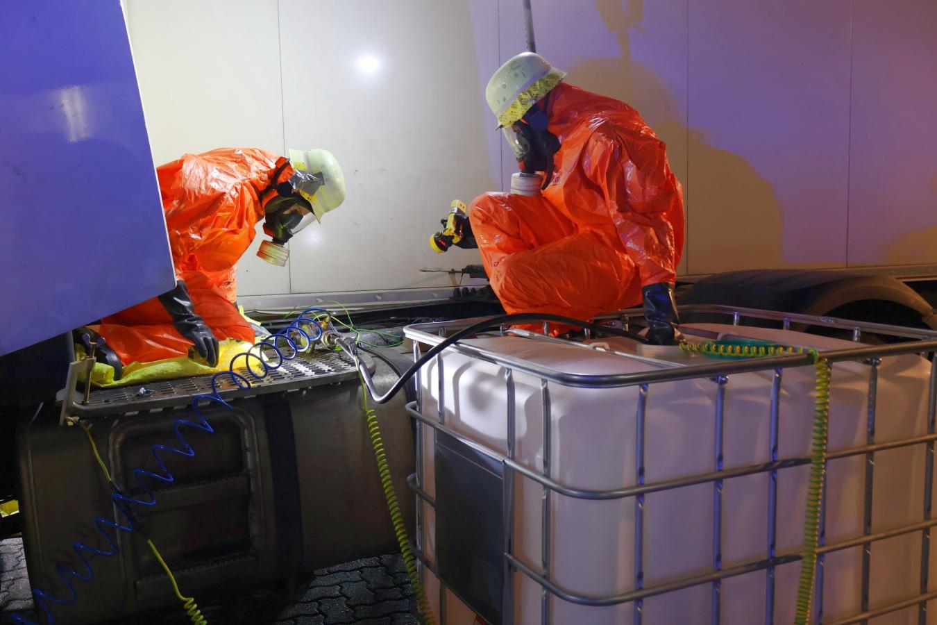 Durch die Einsatzkräfte wurde der Brandschutz sichergestellt und der Auflieger gegen weiteres Abrutschen gesichert und in eine waagerechte Position gebracht. Von den Umwelteinheiten wurden der verbleibende Kraftstoff in einen externen Tank umgepumpt und Messungen vorgenommen.