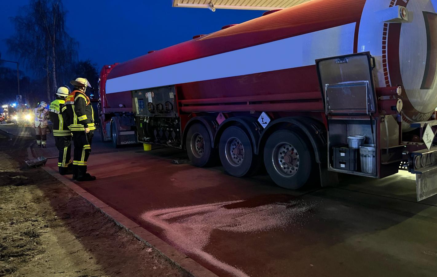Vor Ort gab es beim Beliefern einer Tankstelle an der Konrad-Adenauer-Allee einen Stoffaustritt an einem Tanklastzug. Ein Sensor war aus einem Tankstutzen gefallen und hatte so für den Austritt des Mediums gesorgt. Noch vor dem Eintreffen der Feuerwehrkräfte hatte der Fahrer den Austritt selbst stoppen können, etwa 100 Liter der 1600 Liter fassenden Kammer waren ausgelaufen.
