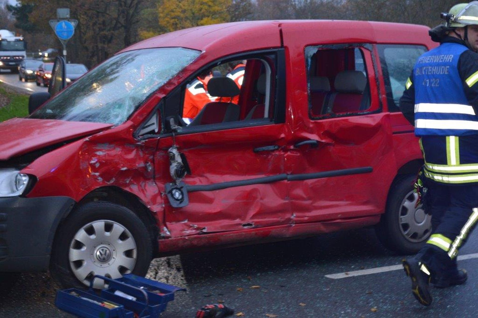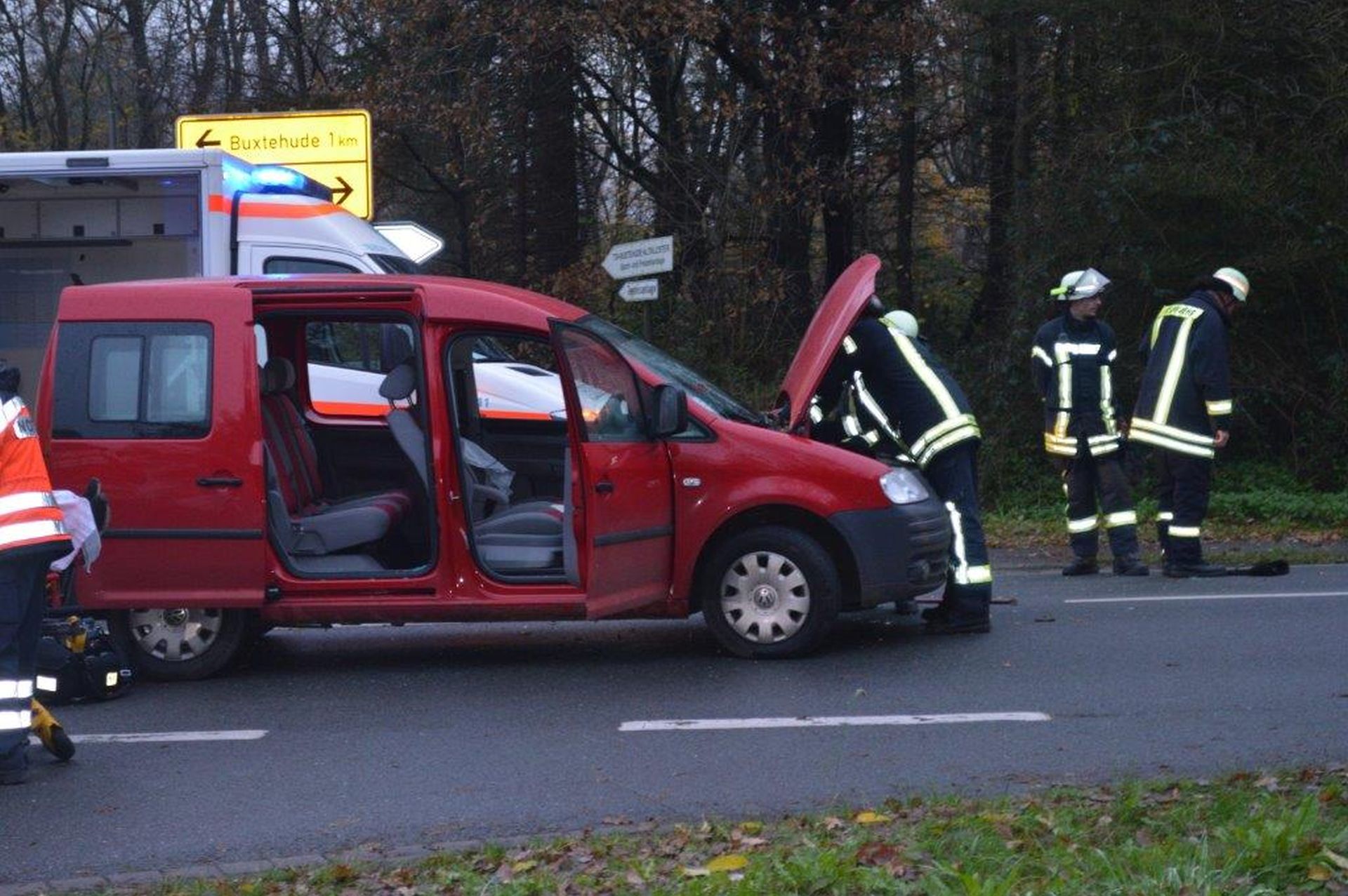 Durch die Wucht des Aufpralls wurde der VW herumgeschleudert und der Fahrer zunächst in seinem Fahrzeug eingeschlossen. Er konnte durch die angerückten Feuerwehrleute der Ortsfeuerwehr Buxtehude schnell befreit werden und wurde nach der Erstversorgung durch den Buxtehuder Notarzt vom Rettungsdienst mit zum Glück nur leichten Verletzungen ins Elbeklinikum eingeliefert.