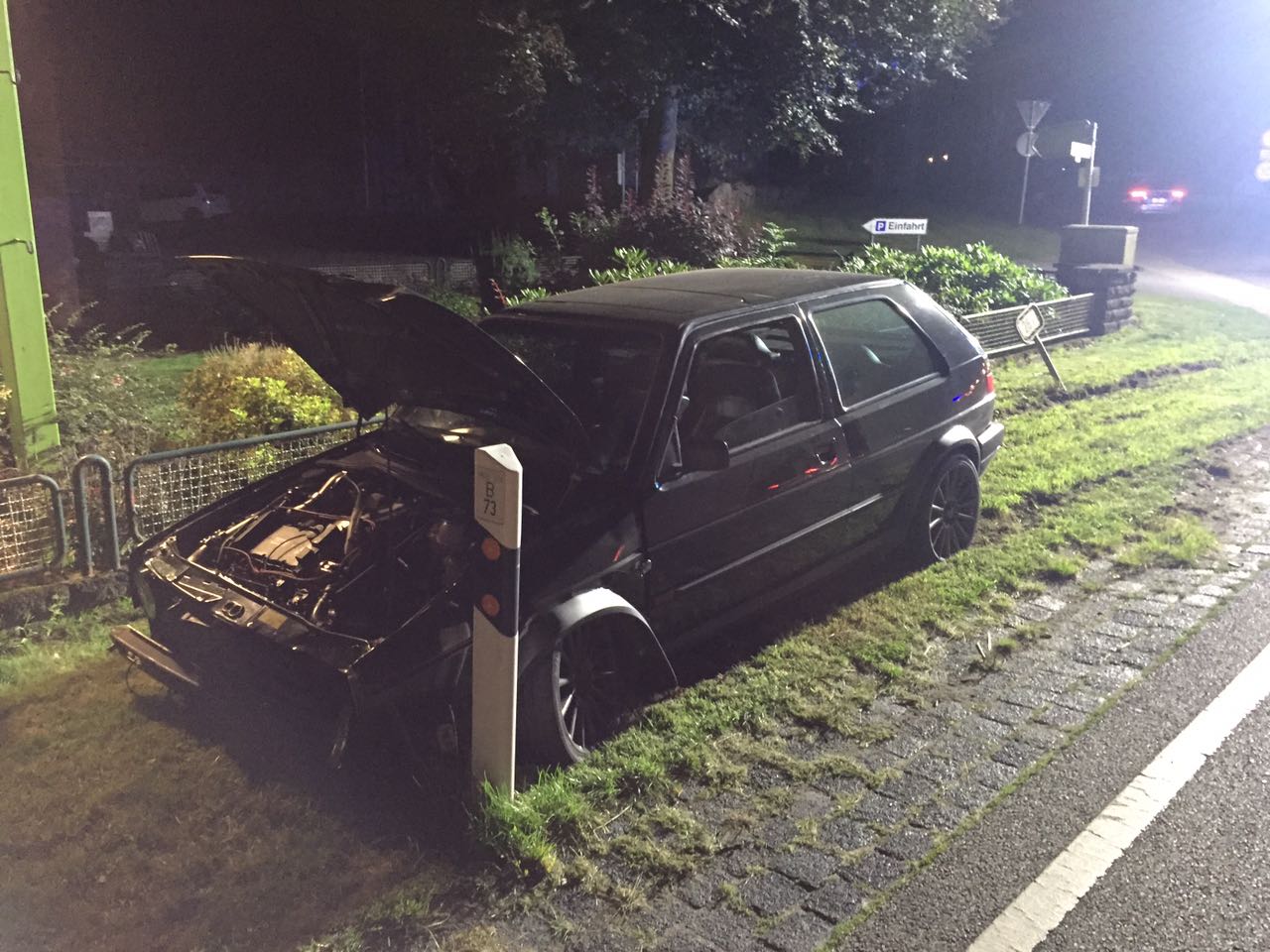 Ein Verkehrsunfall in Ovelgönne sorgte am Donnerstagabend für ein Trümmerfeld auf der Bundesstraße. Der Fahrer eines aus Richtung Stade kommenden PKW hatte in Höhe des chinesischen Restaurants die Kontrolle über sein Fahrzeug verloren und die dortige Verkehrsinsel regelrecht überflogen. Die im Weg stehenden Verkehrsschilder und eine Straßenlaterne wurden abgerissen. Durch die unterschiedlichen Aufprallpunkte wurden an dem Fahrzeug sowohl der Motorblock, als auch die Ölwanne und das Getriebe aufgerissen. Das austretende Öl des bis zur Kreuzung Hemberg rutschenden Autos sorgte für eine großflächige Verschmutzung der Fahrbahn.
